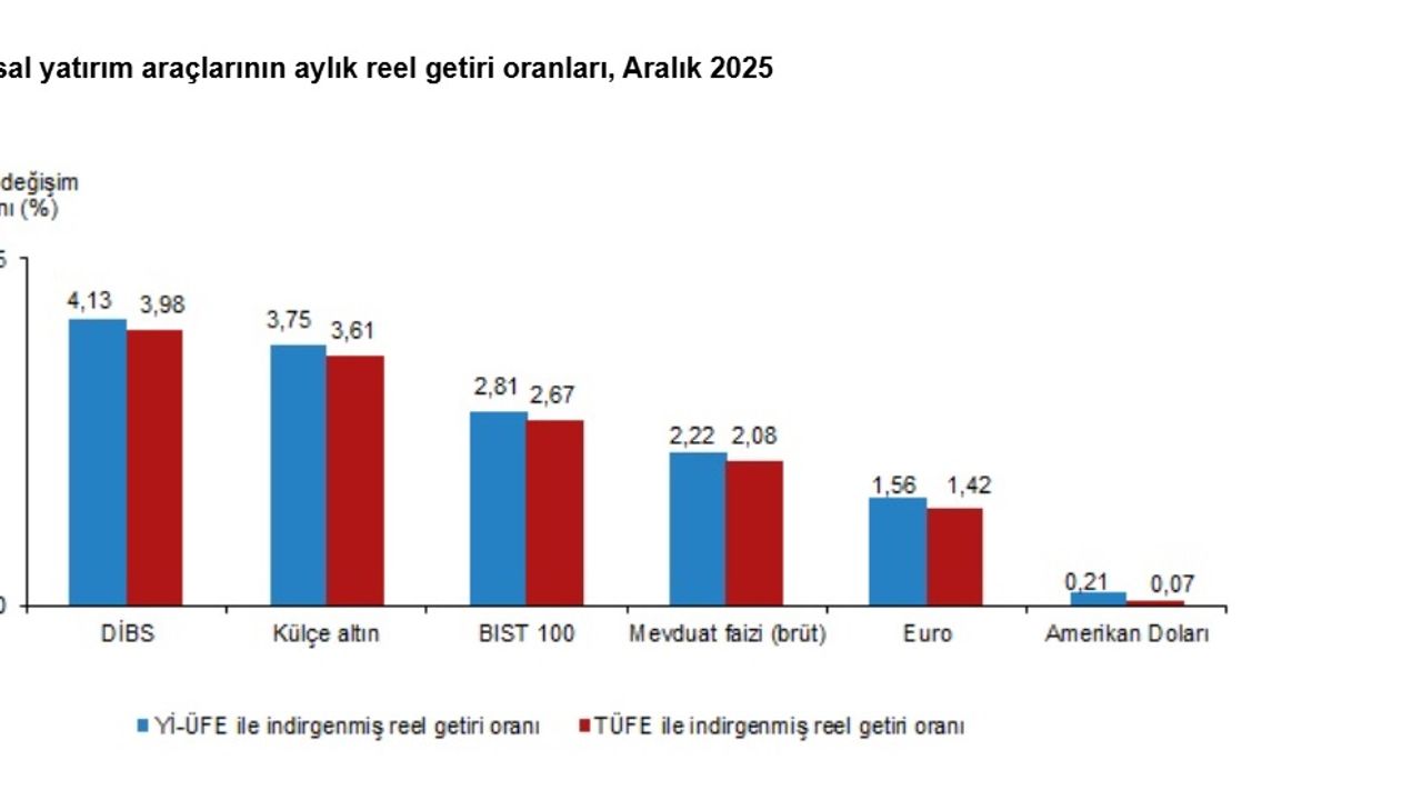 TÜİK, Aralık 2025 dönemine ilişkin finansal yatırım araçlarının reel getiri oranlarını açıkladı. Buna göre; aylık en yüksek reel getiri, yurt içi üretici fiyat endeksi (Yİ-ÜFE) ile indirgendiğinde yüzde 4,13, tüketici fiyat endeksi (TÜFE) ile indirgendiğinde yüzde 3,98 oranlarıyla DİBS'te gerçekleşti. Yİ-ÜFE ile indirgendiğinde; yatırım araçlarından, külçe altın yüzde 3,75, BİST 100 endeksi yüzde 2,81, mevduat faizi (brüt) yüzde 2,22, avro yüzde 1,56 ve dolar yüzde 0,21 oranlarında yatırımcısına reel getiri sağladı. TÜFE ile indirgendiğinde; külçe altın yüzde 3,61, BİST 100 endeksi yüzde 2,67, mevduat faizi (brüt) yüzde 2,08, avro yüzde 1,42 ve dolar yüzde 0,07 oranında yatırımcısına reel getiri sağladı.