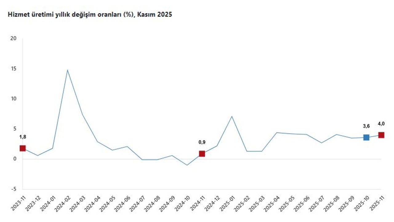 ANKARA, (DHA)- TÜRKİYE İstatistik Kurumu (TÜİK), kasım ayında hizmet üretiminin yıllık yüzde 4; aylık yüzde 0,2 arttığını açıkladı.