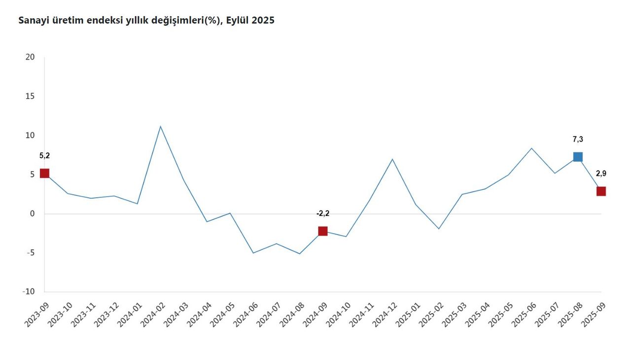 TÜİK, Eylül 2025 dönemine ilişkin sanayi üretim endeksi verilerini açıkladı. Buna göre; sanayi üretimi bir önceki yılın aynı ayına göre yüzde 2,9 arttı. Sanayinin alt sektörleri incelendiğinde, madencilik ve taş ocakçılığı sektörü endeksi bir önceki yılın aynı ayına göre yüzde 3,1 arttı, imalat sanayi sektörü endeksi yüzde 2,7 arttı ve elektrik, gaz, buhar ve iklimlendirme üretimi ve dağıtımı sektörü endeksi yüzde 5,3 arttı.