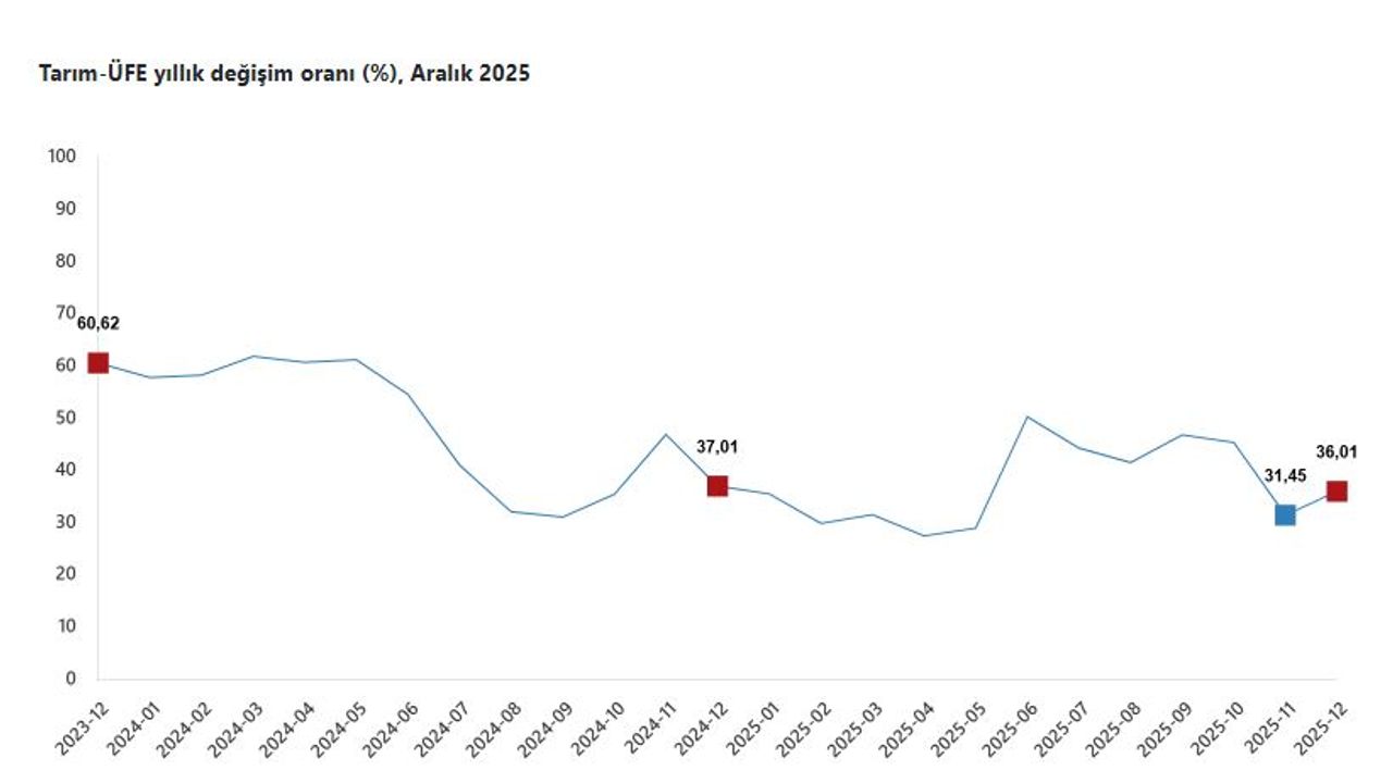 TÜİK, Aralık 2025 dönemine ilişkin tarım ürünleri üretici fiyat endeksi verilerini açıkladı. Buna göre; tarım ürünleri üretici fiyatları aralık ayında bir önceki aya göre yüzde 3,06, bir önceki yılın aynı ayına göre yüzde 36,01 ve 12 aylık ortalamalara göre yüzde 37,47 arttı.