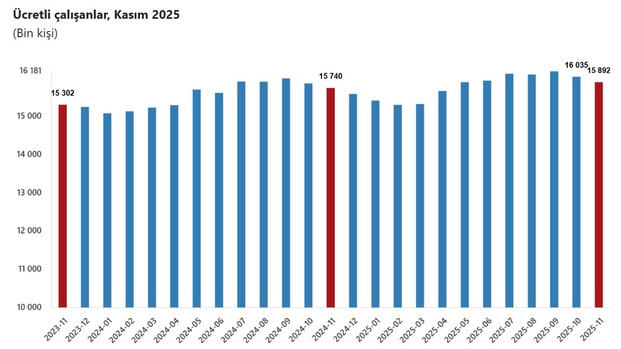 TÜİK, Kasım 2025 dönemine ilişkin ücretli çalışan istatistiklerini açıkladı. Buna göre; sanayi, inşaat ve ticaret-hizmet sektörleri toplamında ücretli çalışan sayısı bir önceki yılın aynı ayına göre yüzde 1 arttı. Ücretli çalışan sayısı bir önceki yılın aynı ayında 15 milyon 740 bin 143 kişi iken, 2025 yılı Kasım ayında 15 milyon 891 bin 801 kişi oldu. Ücretli çalışanların alt detaylarına bakıldığında; kasım ayında ücretli çalışan sayısı yıllık olarak sanayi sektöründe yüzde 3,6 azaldı, inşaat sektöründe yüzde 6,4 arttı ve ticaret-hizmet sektöründe yüzde 2,4 arttı. Sanayi, inşaat ve ticaret-hizmet sektörleri toplamında ücretli çalışan sayısı bir önceki aya göre yüzde 0,1 arttı. Ücretli çalışanların alt detaylarına bakıldığında; kasım ayında ücretli çalışanlar aylık olarak sanayi sektöründe yüzde 0,2 azaldı, inşaat sektöründe yüzde 0,5 arttı ve ticaret-hizmet sektöründe yüzde 0,2 arttı. (DHA)