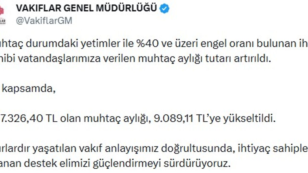 Vakıflar Genel Müdürlüğü'nün, sanal medya hesabından yapılan açıklamada, 'Muhtaç durumdaki yetimler ile yüzde 40 ve üzeri engel oranı bulunan ihtiyaç sahibi vatandaşlarımıza verilen muhtaç aylığı tutarı artırıldı. Bu kapsamda; 7 bin 326,40 TL olan muhtaç aylığı, 9 bin 089,11 TL'ye yükseltildi. Asırlardır yaşatılan vakıf anlayışımız doğrultusunda, ihtiyaç sahiplerine uzanan destek elimizi güçlendirmeyi sürdürüyoruz' ifadelerine yer verildi. (DHA)