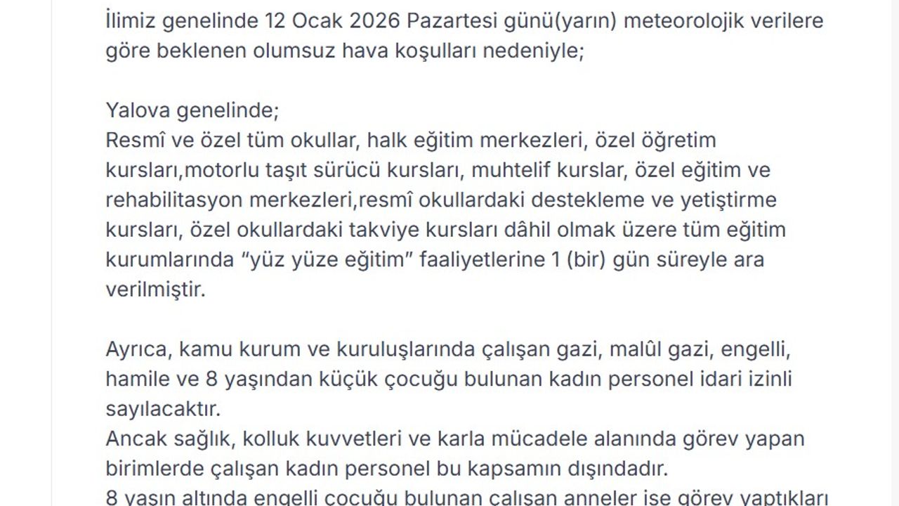 Yalova Valiliği meteorolojik verilere göre beklenen olumsuz hava koşulları nedeniyle eğitim ve öğretime bir gün süreyle ara verildiğini açıkladı. Yalova Valisi Hülya Kaya, sanal medya hesabından yaptığı paylaşımda, 'Yalova genelinde; resmi ve özel tüm okullar, halk eğitim merkezleri, özel öğretim kursları, motorlu taşıt sürücü kursları, muhtelif kurslar, özel eğitim ve rehabilitasyon merkezleri, resmi okullardaki destekleme ve yetiştirme kursları, özel okullardaki takviye kursları dahil olmak üzere tüm eğitim kurumlarında yüz yüze eğitim faaliyetlerine 1 gün süreyle ara verilmiştir. Ayrıca, kamu kurum ve kuruluşlarında çalışan gazi, malül gazi, engelli, hamile ve 8 yaşından küçük çocuğu bulunan kadın personel idari izinli sayılacaktır. Ancak sağlık, kolluk kuvvetleri ve karla mücadele alanında görev yapan birimlerde çalışan kadın personel bu kapsamın dışındadır. 8 yaşın altında engelli çocuğu bulunan çalışan anneler ise görev yaptıkları birim fark etmeksizin idari izinli sayılacaktır. Tüm vatandaşlarımızdan, olumsuz hava koşullarına karşı dikkatli ve tedbirli olmalarını rica ediyorum' ifadeleri kullanıldı. (DHA)