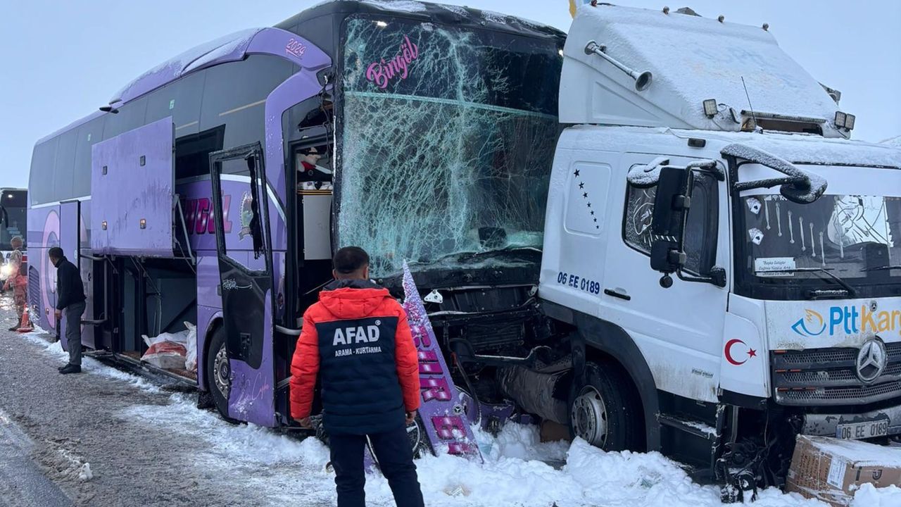 Kaza, Sarıkamış ilçesi Karakurt mevkisinde meydana geldi. Emre Can A.'nın kullandığı 06 EE 0189 plakalı kargo kamyonu, kar yağışı nedeniyle kayganlaşan yolda kontrolden çıktı. Kamyon refüje çarparak durdu. Bu sırada seyreden Mehmet Zülküf Ç.'nın kullandığı 23 AEV 640 plakalı yolcu otobüsü, kamyona çarptı. Bölgeye, AFAD, sağlık ve jandarma ekipleri sevk edildi. Kazada yaralanan 9 kişi, ambulanslarla çevredeki hastanelere kaldırıldı. Kaza nedeniyle kara yolunda ulaşım kontrollü sağlanıyor. (DHA)