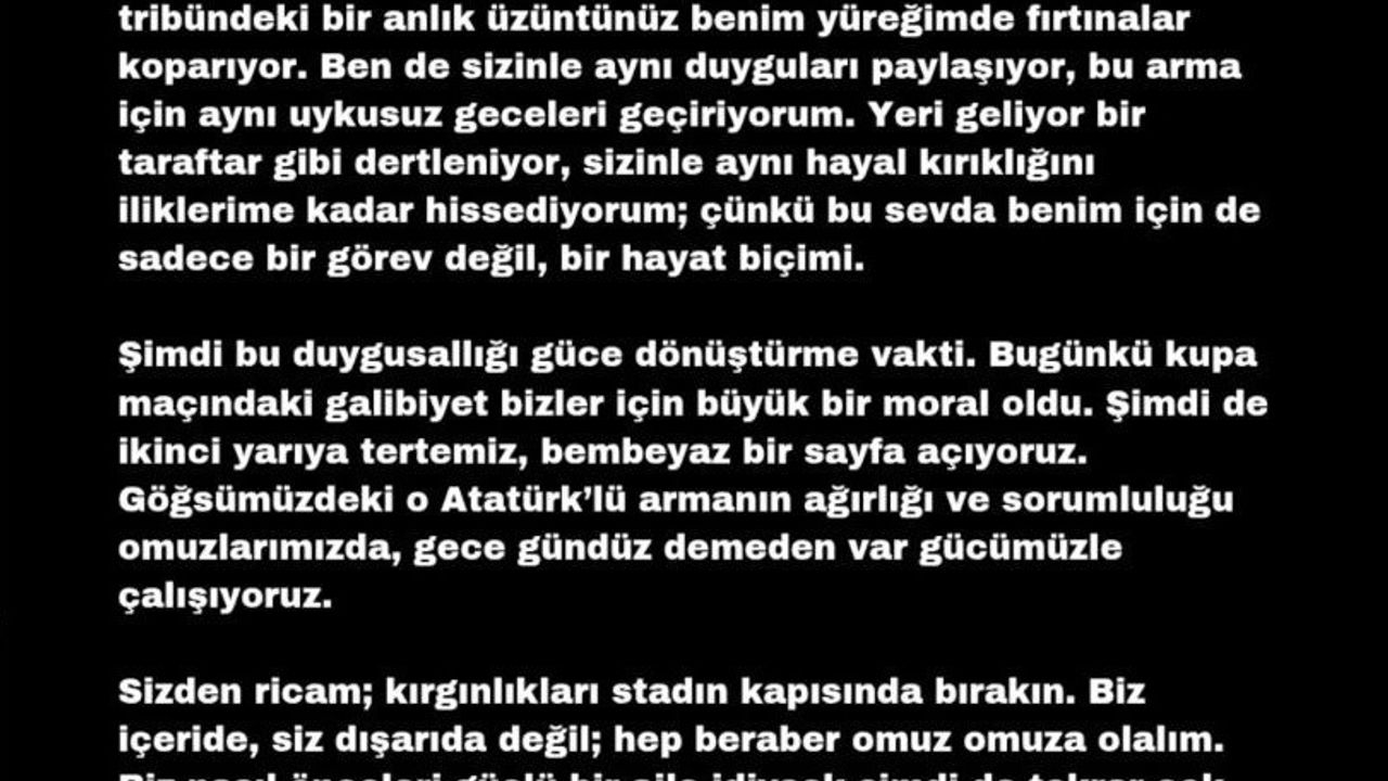 Taraftarların ligin ikinci yarısında da tribünleri doldurarak takımlarına destek olmaları konusunda çağrıda bulunan Yıldırım, 'Büyük Samsunspor Taraftarı; biliyorum, bazen kırıldınız, bazen yoruldunuz. İnanın, sizin o tribündeki bir anlık üzüntünüz benim yüreğimde fırtınalar koparıyor. Ben de sizinle aynı duyguları paylaşıyor, bu arma için aynı uykusuz geceleri geçiriyorum. Yeri geliyor bir taraftar gibi dertleniyor, sizinle aynı hayal kırıklığını iliklerime kadar hissediyorum. Çünkü bu sevda benim için de sadece bir görev değil, bir hayat biçimi. Şimdi bu duygusallığı güce dönüştürme vakti. Kupa maçındaki galibiyet bizler için büyük bir moral oldu. Şimdi de ikinci yarıya tertemiz, bembeyaz bir sayfa açıyoruz. Göğsümüzdeki o Atatürklü armanın ağırlığı ve sorumluluğu omuzlarımızda, gece gündüz demeden var gücümüzle çalışıyoruz' ifadelerini kullandı.