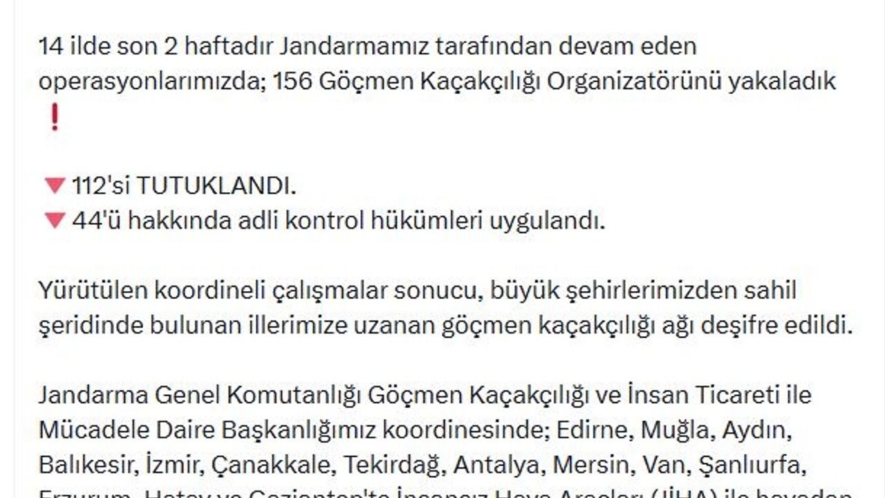 İçişleri Bakanı Ali Yerlikaya, jandarma tarafından son 2 haftadır düzenlenen operasyonları sosyal medya hesabından duyurdu. Buna göre; İl Jandarma Komutanlıklarınca yürütülen operasyonda 156 göçmen kaçakçılığı organizatörü yakalandı. Şüphelilerin 112'si tutuklandı, 44'ü hakkında adli kontrol hükümleri uygulandı. Operasyonda ayrıca 120 araç ile 13 bot ele geçirildi.