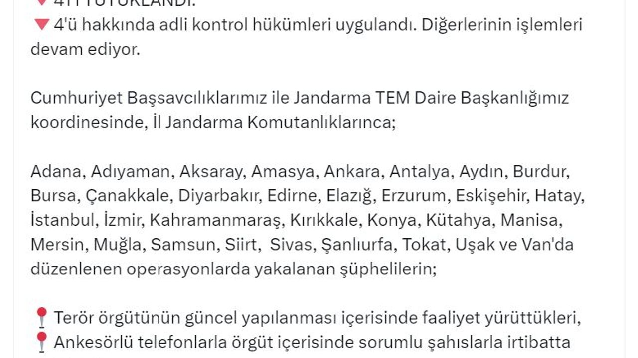 Bakan Yerlikaya, "Operasyonlarda yakalanan şüphelilerin; terör örgütünün güncel yapılanması içerisinde faaliyet yürüttükleri, ankesörlü telefonlarla örgüt içerisinde sorumlu şahıslarla irtibatta bulundukları, terör örgütüyle iltisaklı sözde yardım kuruluşlarına finans sağladıkları ve sosyal medya hesapları üzerinden FETÖ’nün propagandasını yaptıkları tespit edildi. Savcılıklarımızca haklarında soruşturma başlatıldı. Emeği geçenleri tebrik ediyorum" dedi. (DHA)