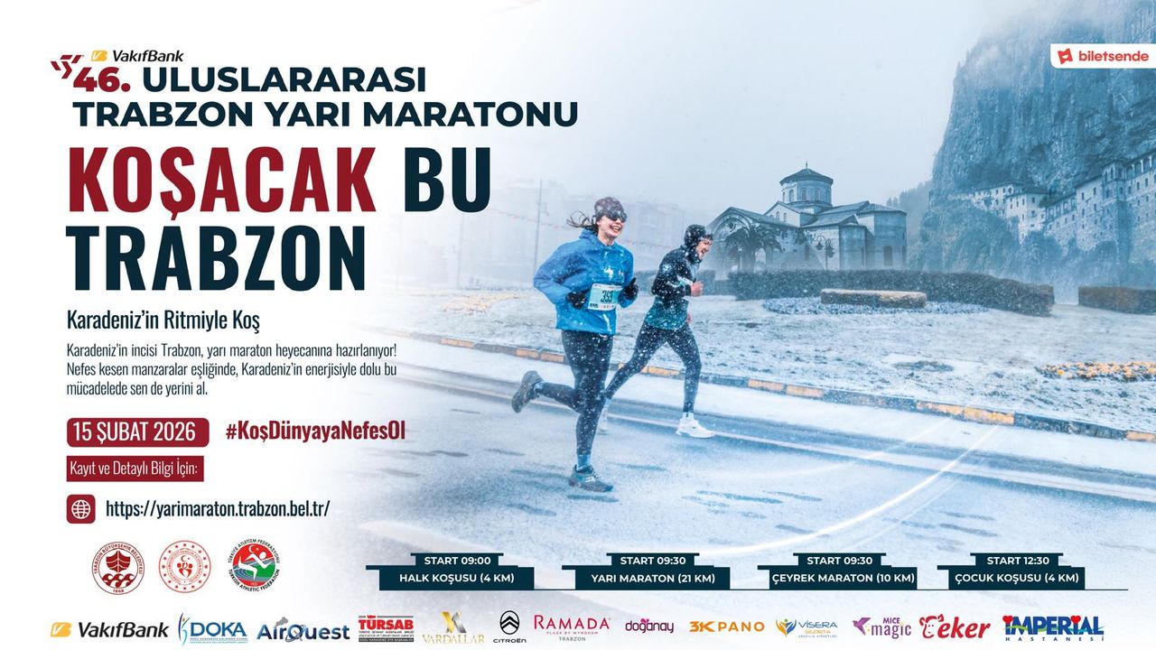 Trabzon'un düşman işgalinden kurtuluşunun 108'inci yıl dönümü dolayısıyla bu yıl 'Koş Dünyaya Nefes Ol' sloganıyla düzenlenecek olan VakıfBank 46'ncı Uluslararası Trabzon Yarı Maratonu, 15 Şubat 2026 Pazar günü gerçekleştirilecek. Trabzon Büyükşehir Belediyesi'nin spor turizmini canlandırma ve kenti uluslararası arenada daha görünür kılma hedefiyle hayata geçirdiği yarı maraton, bu yıl da yoğun ilgi görüyor. Organizasyona, aralarında elit sporcuların da bulunduğu 40 farklı ülkeden profesyonel atletlerin katılması beklenirken, şu ana kadar yaklaşık 3 bin kişi kayıt yaptırdı.