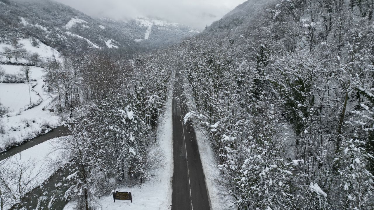 Ayhan ACAR/BARTIN, (DHA)- BARTIN ile Karabük arasında iki tarafı ağaçlarla kaplı olan ve 'Ağaç tünel yol' olarak bilinen kara yolunda, kar yağışıyla birlikte ortaya çıkan manzara, dron ile görüntülendi.
