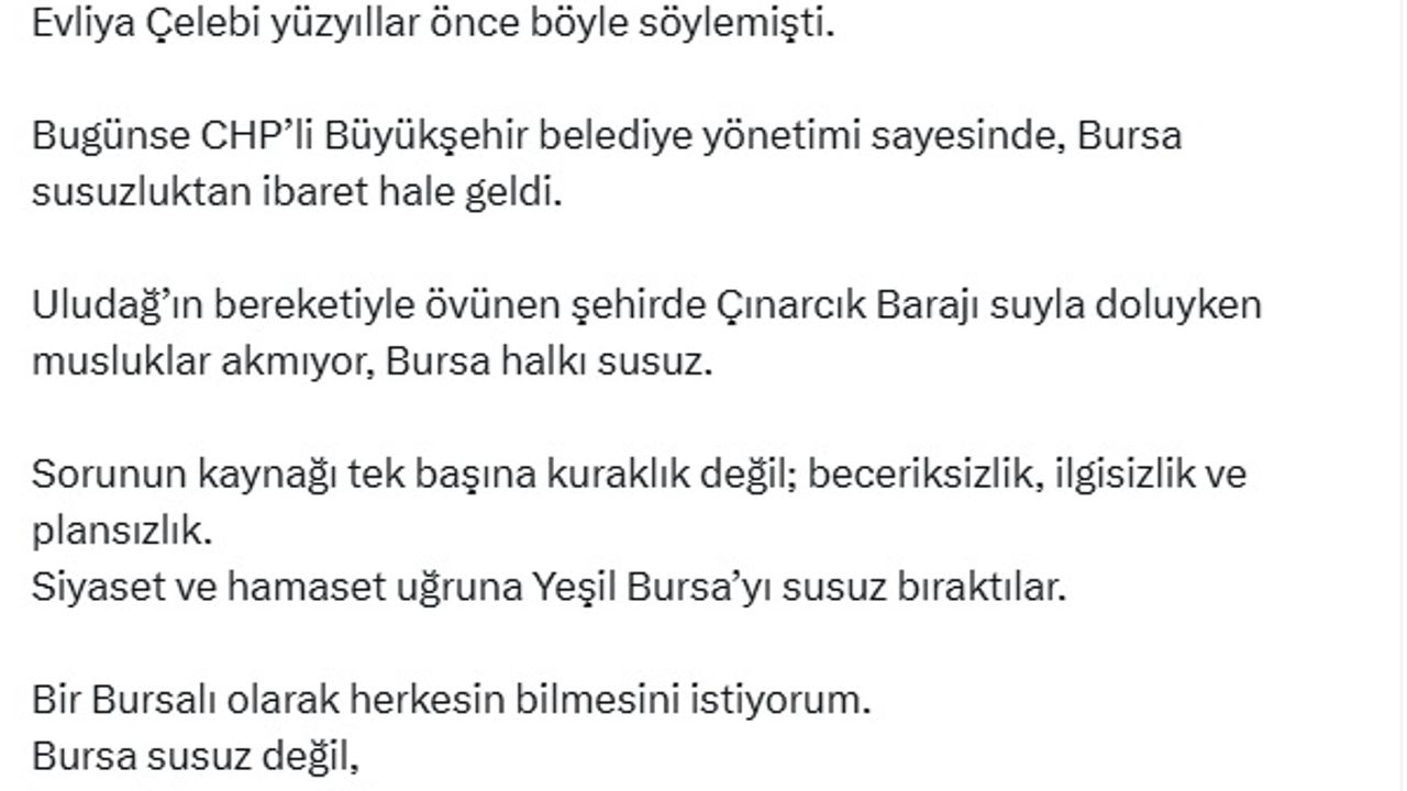 AK Parti Genel Başkan Yardımcısı Faruk Acar sosyal medya hesabından yaptığı paylaşımda, “Velhasıl Bursa sudan ibarettir. Evliya Çelebi yüzyıllar önce böyle söylemişti. Bugünse CHP’li Büyükşehir belediye yönetimi sayesinde, Bursa susuzluktan ibaret hale geldi. Uludağ’ın bereketiyle övünen şehirde Çınarcık Barajı suyla doluyken musluklar akmıyor, Bursa halkı susuz. Sorunun kaynağı tek başına kuraklık değil; beceriksizlik, ilgisizlik ve plansızlık. Siyaset ve hamaset uğruna Yeşil Bursa’yı susuz bıraktılar. Bir Bursalı olarak herkesin bilmesini istiyorum. Bursa susuz değil, bu şehrin susuzluğu, CHP belediyeciliğin özeti ve Bursa’ya yansımasıdır” ifadelerini kullandı. (DHA)