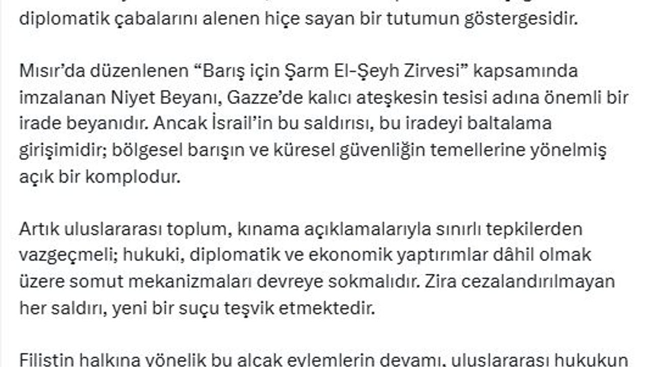 Uluslararası toplumun kınama açıklamalarıyla sınırlı tepkilerden vazgeçmesi gerektiğini belirten Ala, "Uluslararası toplum, hukuki, diplomatik ve ekonomik yaptırımlar dahil olmak üzere somut mekanizmaları devreye sokmalıdır. Zira cezalandırılmayan her saldırı, yeni bir suçu teşvik etmektedir. Filistin halkına yönelik bu alçak eylemlerin devamı, uluslararası hukukun etkisini de hedef almaktadır. Dolayısıyla, barışın korunması iddiasında bulunan hiçbir devlet, bu tür eylemler karşısında tarafsız kalma lüksüne sahip değildir. İsrail’in saldırgan politikalarına karşı kararlı, tutarlı ve yaptırım gücü yüksek bir ortak tepki verilmedikçe, ne bölgesel barıştan ne de küresel adaletten söz etmek mümkündür" dedi. (DHA)
