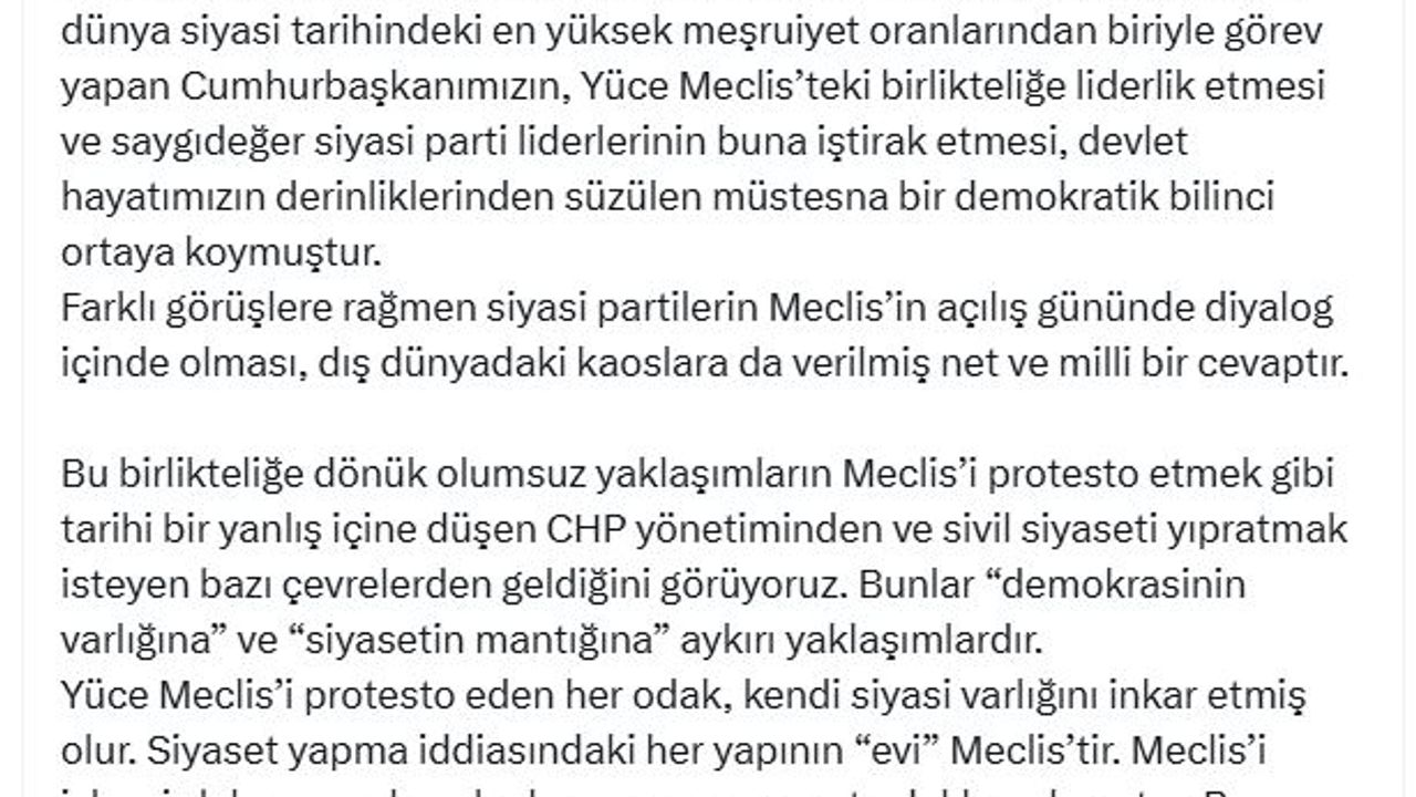 Farklı görüşlere rağmen, siyasi partilerin Meclis'in açılış gününde diyalog içinde olmasının, dış dünyadaki kaoslara verilmiş net ve milli bir cevap olduğunu belirten Çelik, "Bu birlikteliğe dönük olumsuz yaklaşımların, Meclis'i protesto etmek gibi tarihi bir yanlış içine düşen CHP yönetiminden ve sivil siyaseti yıpratmak isteyen bazı çevrelerden geldiğini görüyoruz. Bunlar 'demokrasinin varlığına' ve 'siyasetin mantığına' aykırı yaklaşımlardır. Yüce Meclis'i protesto eden her odak, kendi siyasi varlığını inkar etmiş olur. Siyaset yapma iddiasındaki her yapının evi Meclis'tir. Meclis'i işlevsiz kılmaya çalışanlar her zaman vesayet odakları olmuştur. Bu zihniyetin herhangi bir siyasi partiye nüfuz etmesi vahimdir. Meclis milletin mekanıdır, demokratik siyaset milletin emanetidir. Bu değerlere katkı veren herkesin yaklaşımı saygıdeğerdir. Aksine davranışlar ise milletin emanetine zarar vermektir" dedi. (DHA)