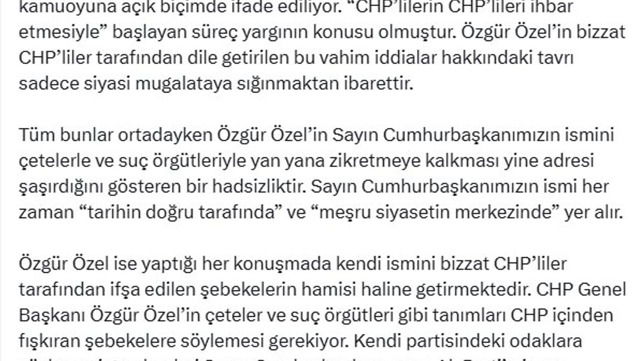AK Parti'li Çelik, sosyal medya hesabından yaptığı açıklamada, "CHP Genel Başkanı Özgür Özel’in partisinden fışkıran skandalları ve yolsuzlukları örtbas etmeye uğraşmaktan başka bir siyasi faaliyeti yok. Bu nedenle de ne iç siyasi gelişmeleri ne de dış politikayı anlayabiliyor. Özgür Özel’e kendi partisi içinden bile 'partiyi temizle' mesajları kamuoyuna açık biçimde ifade ediliyor. CHP’lilerin CHP’lileri ihbar etmesiyle başlayan süreç yargının konusu olmuştur. Özgür Özel’in bizzat CHP’liler tarafından dile getirilen bu vahim iddialar hakkındaki tavrı sadece siyasi mugalataya sığınmaktan ibarettir. Tüm bunlar ortadayken Özgür Özel’in Sayın Cumhurbaşkanımızın ismini çetelerle ve suç örgütleriyle yan yana zikretmeye kalkması yine adresi şaşırdığını gösteren bir hadsizliktir. Sayın Cumhurbaşkanımızın ismi her zaman tarihin doğru tarafında ve meşru siyasetin merkezinde yer alır. Özgür Özel ise yaptığı her konuşmada kendi ismini bizzat CHP’liler tarafından ifşa edilen şebekelerin hamisi haline getirmektedir. CHP Genel Başkanı Özgür Özel’in 'çeteler' ve 'suç örgütleri' gibi tanımları CHP içinden fışkıran şebekelere söylemesi gerekiyor. Kendi partisindeki odaklara söylemesi gerekenleri Sayın Cumhurbaşkanımıza, Ak Parti’mize ve Cumhur İttifakı’mıza söylemesi, 'siyasi navigasyon' probleminin vahim boyutlara ulaştığını göstermektedir. CHP Genel Başkanı olarak Özgür Özel’in öncelikle kendi partisindeki gerçek CHP’lilere kulak vererek partiyi temizlemesi esas işi olmalıdır. Dürüstlük konusundaki cari açık, siyasi dil cambazlığı ile kapatılmaz" dedi. (DHA)