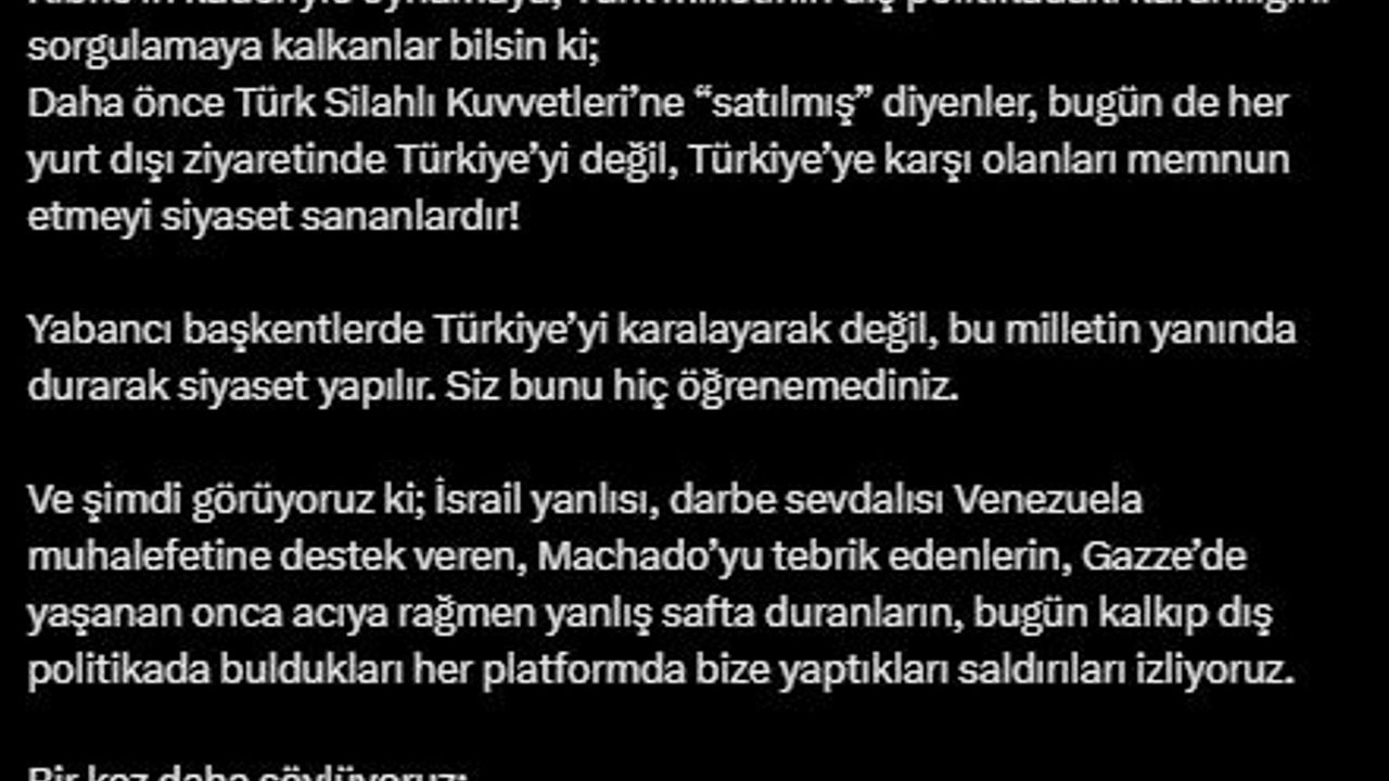 AK Parti'li İnan, sosyal medya hesabından yaptığı paylaşımda, "Kıbrıs’taki seçim sonuçları gelir gelmez, CHP’nin tavırları yine şaşırtmadı. Patagonya’daki seçimlerden bile medet umanlar şimdi de Yavru Vatan’ın iradesini istismar etmeye kalkıyor. Ama açık söylüyoruz; Kıbrıs’ın seçim sonuçlarını Türkiye’ye karşı manipüle etmeye, kendi siyasi hesaplarınıza alet etmeye, oyuncak haline getirmeye kalkamazsınız. Kıbrıs’ın kaderiyle oynamaya, Türk milletinin dış politikadaki kararlılığını sorgulamaya kalkanlar bilsin ki; daha önce Türk Silahlı Kuvvetleri’ne 'satılmış' diyenler, bugün de her yurt dışı ziyaretinde Türkiye’yi değil, Türkiye’ye karşı olanları memnun etmeyi siyaset sananlardır. Yabancı başkentlerde Türkiye’yi karalayarak değil, bu milletin yanında durarak siyaset yapılır. Siz bunu hiç öğrenemediniz. Ve şimdi görüyoruz ki; İsrail yanlısı, darbe sevdalısı Venezuela muhalefetine destek veren, Machado’yu tebrik edenlerin, Gazze’de yaşanan onca acıya rağmen yanlış safta duranların, bugün kalkıp dış politikada buldukları her platformda bize yaptıkları saldırıları izliyoruz. Bir kez daha söylüyoruz; İsrail destekçilerinin sıralarına girenlerin dış politikada söz söyleme hakları yoktur, olamaz. Kıbrıs denince aklına bağımsızlık değil, sahte diplomayla mezuniyet planı gelenler; bugün gayrimeşru bir genel başkanlıkla bu millete ne yön gösterebilir ne istikamet çizebilir. Türkiye ve Kuzey Kıbrıs Türk Cumhuriyeti, dün olduğu gibi bugün de bir ve beraberdir. Ve biz, bu birliğe göz diken her anlayışa karşı dimdik durmaya devam edeceğiz" dedi. (DHA)