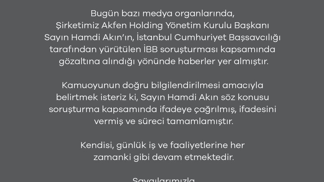 İSTANBUL, (DHA) - AKFEN Holding'den yapılan açıklamada "Bugün bazı medya organlarında, Şirketimiz Akfen Holding Yönetim Kurulu Başkanı sayın Hamdi Akın'ın, İstanbul Cumhuriyet Başsavcılığı tarafından yürütülen İBB soruşturması kapsamında gözaltına alındığı yönünde haberler yer almıştır" denildi.
