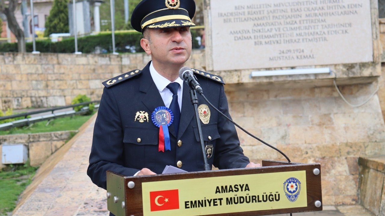 İl Emniyet Müdürü Ayhan Saraç'ın Atatürk Anıtı'na çelenk bırakmayışla başlarken, ardından saygı duruşu ve İstiklal Marşı ile devam etti. Törende konuşan Emniyet Müdürü Ayhan Saraç, 'Polis Teşkilatımızın 181'inci kuruluş yıl dönümünü kutladığımız bu günde teşkilatımız devletimizin sağladığı en üst düzeydeki imkanları kullanarak halkımızın güven ve desteğiyle suç ve suçluyla mücadele etmekten asla yılmadı, bundan sonra da yılmayacaktır. Amasya'nın huzuru Türkiye'nin huzurudur anlayışıyla bulunduğumuz her noktada, her koşulda şehrimizin güvenliği için tüm gücümüzle çalışmaya devam edeceğiz. Üstlendiğimiz bu kutsal görevde bu güzel şehirde yaşayan insanların hayır dualarının ve güzel dileklerinin daima bizimle olduğunu biliyoruz. Bize duyulan bu güveni asla sarsmayacağız. Sorumluluğumuzun bilincinde olarak bunları yerine getirerek devletimize ve milletimize olan bağlılığımızı, sevgimizi göstermeye devam edeceğiz. Gerektiğinde vatanımız uğrunda şehit olmaktan, gazi olmaktan bir an olsun tereddüt etmeyeceğiz. Büyük önderimiz Gazi Mustafa Kemal Atatürk ve silah arkadaşlarına, vatanımızın bağımsızlığı, bütünlüğü ve güvenliği için can veren kahraman şehitlerimize rahmet diliyor, kahraman gazilerimize şükran ve minnetlerimi sunuyorum. Polis günümüz kutlu olsun' dedi.