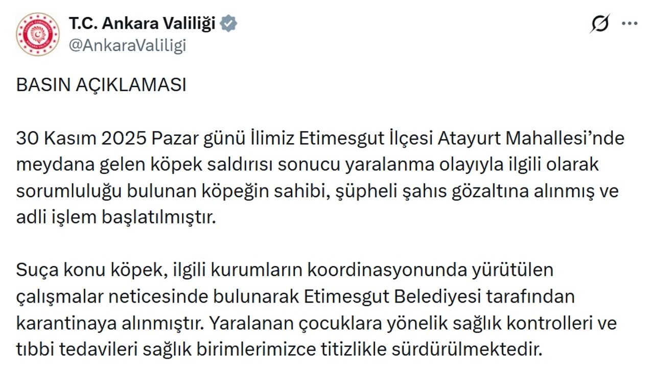 Ankara Valiliği, olaya ilişkin sosyal medya hesabından açıklama yaptı. Açıklamada, "30 Kasım 2025 Pazar günü İlimiz Etimesgut ilçesi Atayurt Mahallesi’nde meydana gelen köpek saldırısı sonucu yaralanma olayıyla ilgili olarak sorumluluğu bulunan köpeğin sahibi, şüpheli şahıs gözaltına alınmış ve adli işlem başlatılmıştır. Suça konu köpek, ilgili kurumların koordinasyonunda yürütülen çalışmalar neticesinde bulunarak Etimesgut Belediyesi tarafından karantinaya alınmıştır. Yaralanan çocuklara yönelik sağlık kontrolleri ve tıbbi tedavileri sağlık birimlerimizce titizlikle sürdürülmektedir" denildi. (DHA)