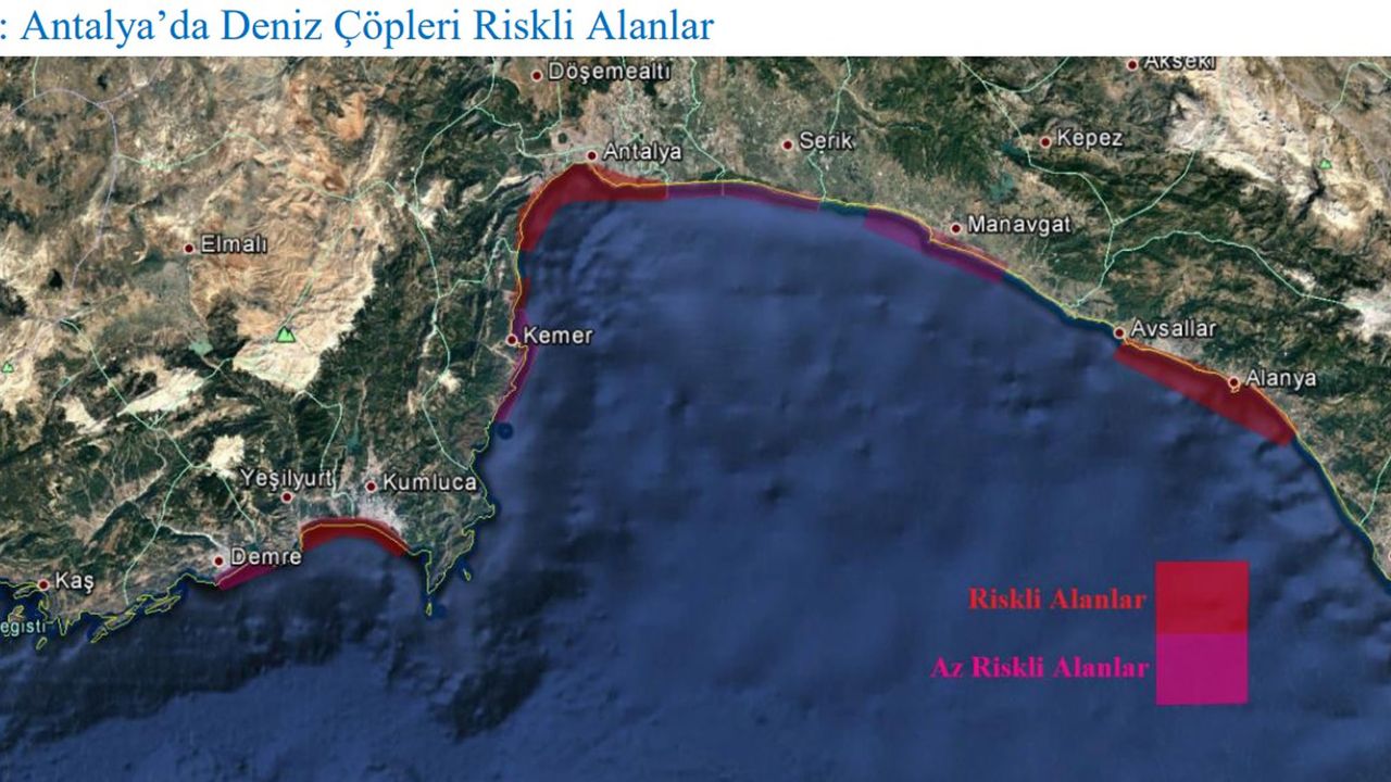 Antalya'da, yüzey akıntıları, hakim rüzgar yönleri, şehirleşme, turizm ve denizcilik aktiviteleri, tarımsal aktiviteler, vatandaşlar tarafından yapılan bildirimler ve bilimsel çalışmalar dikkate alındığında kent merkezi, Alanya, Finike ve Kumluca ilçesinin sahillerinin bulunduğu Finike Körfezi ile Kemer ilçesindeki Beldibi ve Göynük sahillerinin deniz çöpleri bulunma açısından riskli, Manavgat, Belek, Aksu, Kemer merkez ve Demre sahillerinin deniz çöpleri açısından az riskli olduğu değerlendirildi.