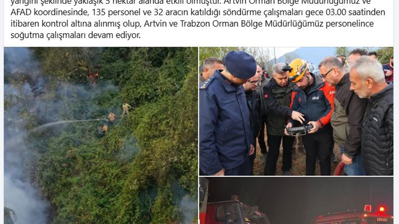 Artvin Orman Bölge Müdürlüğü’nün sosyal medya hesabından yapılan açıklamada, yangınının yaklaşık 5 hektarda etkili olduğu belirtildi. Orman Bölge Müdürlüğü ve AFAD koordinesinde, 135 personel ve 32 aracın katıldığı çalışmalar sonucu yangının kontrol altına alındığı vurgulanan açıklamada, Artvin ve Trabzon Orman Bölge Müdürlüğü personelince soğutma çalışmalarına devam edildiği belirtildi. (DHA)