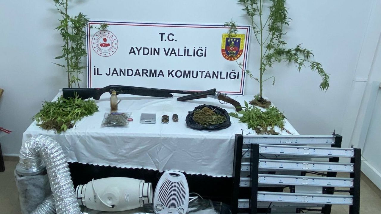 Aydın İl Jandarma Komutanlığı Narkotik Suçlarla Mücadele Şube Müdürlüğü, İstihbarat Şube Müdürlüğü ve Kuşadası İlçe Jandarma Komutanlığı ekiplerince dün uyuşturucu üretimi, kullanımı ve ticaretine yönelik operasyon gerçekleştirildi. Bu kapsamda ekipler, 2 şüphelinin Davutlar Mahallesi'nde iklimlendirme yöntemi ile Hint keneviri yetiştirdiğini tespit etti. Operasyon için harekete geçen ekipler, kullanılan arazide Söke Köpek Timi ile arama gerçekleştirdi. Yapılan aramada 45 kök Hint keneviri, 90 gram kubar esrar, 1 uyuşturucu kullanma aparatı, 1 hassas terazi, 2 öğütücü aparatı, 2 av tüfeği, 2 termal çadır, 2 havalandırma makinası, 4 metre havalandırma borusu, 3 led ışık ve 2 de cep telefonu ele geçirdi. Yakalanan 2 şüpheli gözaltına alındı.