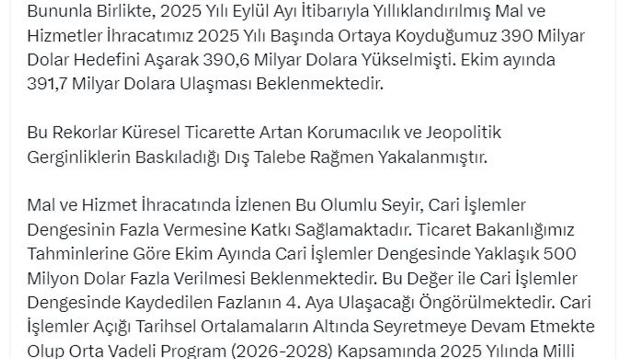 Bu rekorların küresel ticarette artan korumacılık ve jeopolitik gerginliklerin baskıladığı dış talebe rağmen yakalandığını belirten Bakan Bolat, "Mal ve hizmet ihracatında izlenen bu olumlu seyir, cari işlemler dengesinin fazla vermesine katkı sağlamaktadır. Ticaret Bakanlığı tahminlerine göre ekim ayında cari işlemler dengesinde yaklaşık 500 milyon dolar fazla verilmesi beklenmektedir. Bu değer ile cari işlemler dengesinde kaydedilen fazlanın 4'üncü aya ulaşacağı öngörülmektedir. Cari işlemler açığı tarihsel ortalamaların altında seyretmeye devam etmekte olup orta vadeli program (2026-2028) kapsamında 2025 yılında milli gelire oranla yüzde 1,4 olarak gerçekleşmesi öngörülmektedir. Belirlediğimiz hedefleri aştık, daha üst hedefler için var gücümüzle çalışıyoruz. Ticaret Bakanlığı olarak bu hedefler doğrultusunda ticareti kolaylaştırmak, ihracatçılarımızın rekabet gücünü artırmak, ikiz dönüşüm sürecine uyum sağlamak, ticari diplomasi ağımızı güçlendirmek ve ihracatçılarımıza destek ve finansman imkanları sunmak üzere çalışmalarımızı sürdürüyoruz" açıklamasında bulundu. (DHA)