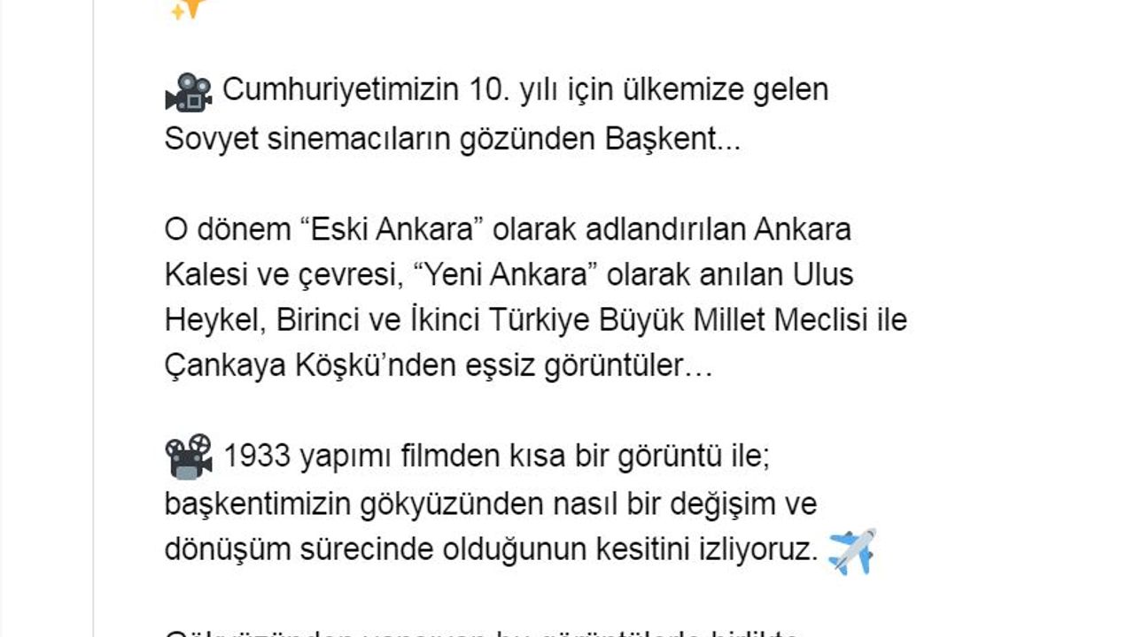 Bakan Ersoy, Ankara'nın başkent oluşunun yıl dönümü nedeniyle NSosyal hesabında, Cumhuriyetin 10'uncu yılı için 1933'te Türkiye'ye gelen Sovyet sinemacıların uçaktan çektiği görüntüleri paylaştı. Ersoy, videoda, o dönem 'Eski Ankara' olarak adlandırılan Ankara Kalesi ve çevresi, 'Yeni Ankara' olarak anılan Ulus Heykel, Birinci ve İkinci Türkiye Büyük Millet Meclisi ile Çankaya Köşkü'nden eşsiz görüntüler yer aldığını belirterek, "1933 yapımı filmden kısa bir görüntü ile başkentimizin gökyüzünden nasıl bir değişim ve dönüşüm sürecinde olduğunun kesitini izliyoruz. Gökyüzünden yansıyan bu görüntülerle birlikte, Ankara'nın başkent oluşunun yıl dönümünü coşkuyla kutluyoruz. Arşiv görüntülerinin tamamına Sinema Genel Müdürlüğümüzün YouTube kanalından ulaşabilirsiniz" dedi.