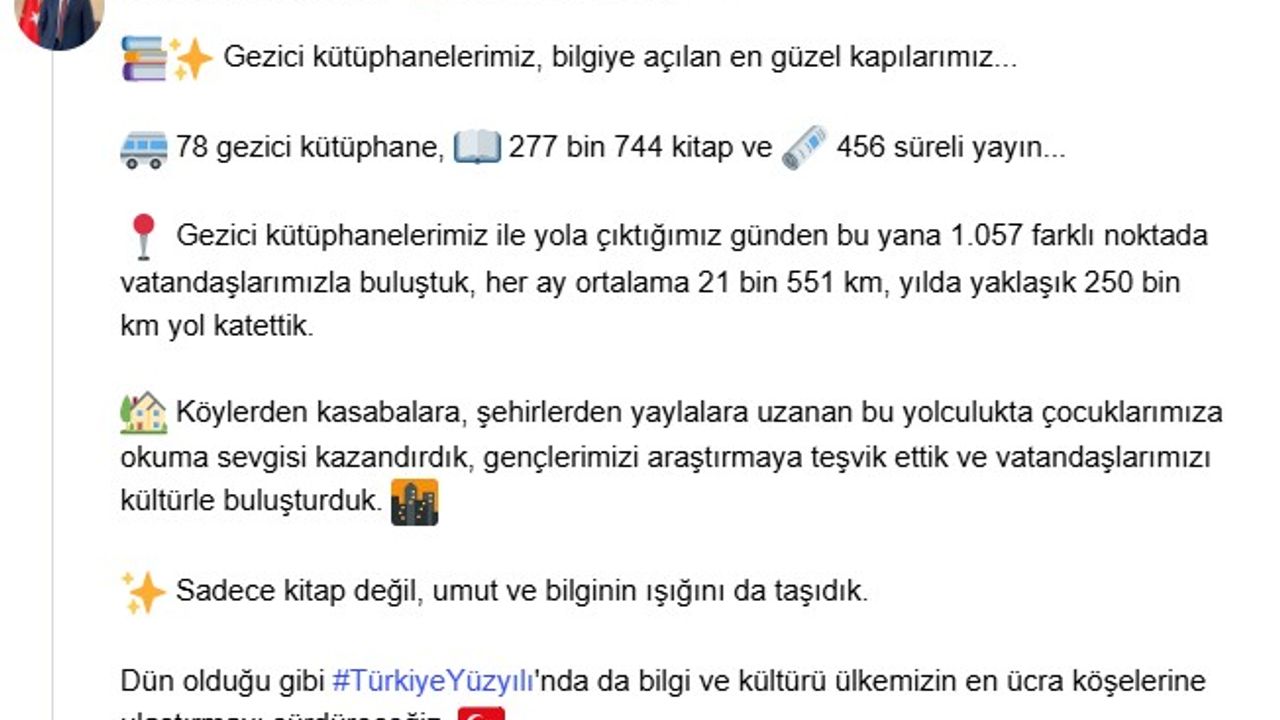 Kültür ve Turizm Bakanı Mehmet Nuri Ersoy, NSosyal hesabından yaptığı paylaşımda, gezici kütüphanelerin 'Türkiye Yüzyılı' vizyonuyla bilgiye erişimin en güzel örneklerinden biri olduğunu vurguladı. Ersoy, "Gezici Kütüphanelerimiz, bilgiye açılan en güzel kapılarımız. 78 gezici kütüphane, 277 bin 744 kitap ve 456 süreli yayın. Gezici Kütüphanelerimiz ile yola çıktığımız günden bu yana 1057 farklı noktada vatandaşlarımızla buluştuk, her ay ortalama 21 bin 551 kilometre, yılda yaklaşık 250 bin kilometre yol katettik. Köylerden kasabalara, şehirlerden yaylalara uzanan bu yolculukta çocuklarımıza okuma sevgisi kazandırdık, gençlerimizi araştırmaya teşvik ettik ve vatandaşlarımızı kültürle buluşturduk. Sadece kitap değil, umut ve bilginin ışığını da taşıdık. Dün olduğu gibi 'Türkiye Yüzyılı'nda da bilgi ve kültürü ülkemizin en ücra köşelerine ulaştırmayı sürdüreceğiz" dedi. (DHA)