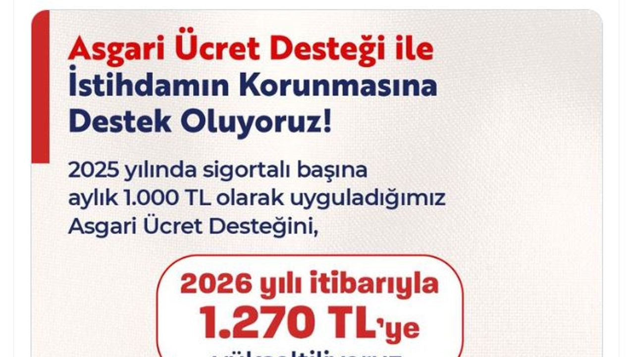 Bakan Işıkhan, sanal medya hesabından 'Güçlü destek, güçlü istihdam' başlığıyla açıklama yaptı. Işıkhan, 'İstihdamı destekleyecek politikalarımızı kararlılıkla sürdürüyoruz. Asgari Ücret Desteğini, 2026 yılı itibarıyla 1270 liraya yükseltmiştik. Önümüzdeki yıl toplam 76,5 milyar liralık kaynakla çalışma hayatımızı daha güçlü kılacak, istihdam kapasitemizi koruyacağız' ifadelerini kullandı. (DHA)