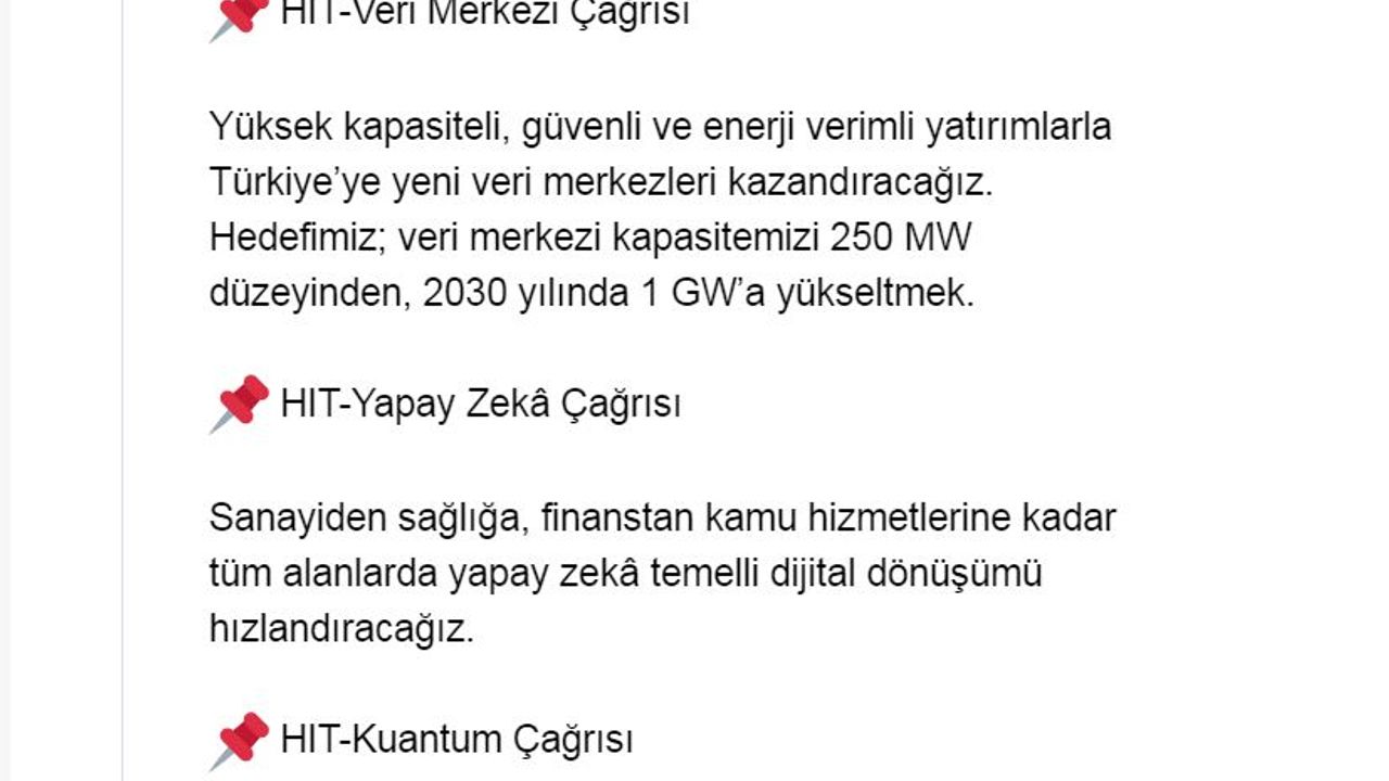 Bakan Kacır, NSosyal hesabından yaptığı açıklamada, HIT-30 Yüksek Teknoloji Yatırım Programı kapsamında 4 yeni çağrının daha ilan edildiğini belirterek, çağrıların hedef ve kapsamlarına ilişkin bilgi verdi. Kacır, "HIT-Veri Merkezi Çağrısı ile yüksek kapasiteli, güvenli ve enerji verimli yatırımlarla Türkiye'ye yeni veri merkezleri kazandıracağız. Hedefimiz, veri merkezi kapasitemizi 250 MW düzeyinden, 2030 yılında 1 GW’a yükseltmek. HIT-Yapay Zeka Çağrısı ile sanayiden sağlığa, finanstan kamu hizmetlerine kadar tüm alanlarda yapay zeka temelli dijital dönüşümü hızlandıracağız. HIT-Kuantum Çağrısı ile klasik hesaplamaların ötesine geçen kuantum teknolojilerini ülkemize kazandıracak, Türkiye’nin bilimsel bağımsızlığına güç katacak bir sıçrama başlatıyoruz. HIT-Endüstriyel Robot Çağrısı ile robot teknolojilerini sadece kullanan değil, geliştiren, üreten ve dünyaya ihraç eden bir ülke olmayı hedefliyoruz. 2030 yılında 200 bin endüstriyel robotun kullanılmasına yönelik yatırımları hızlandırırken, bu ihtiyacın yerli üretimle karşılanmasına yönelik destekler sunuyoruz" ifadelerini kullandı.