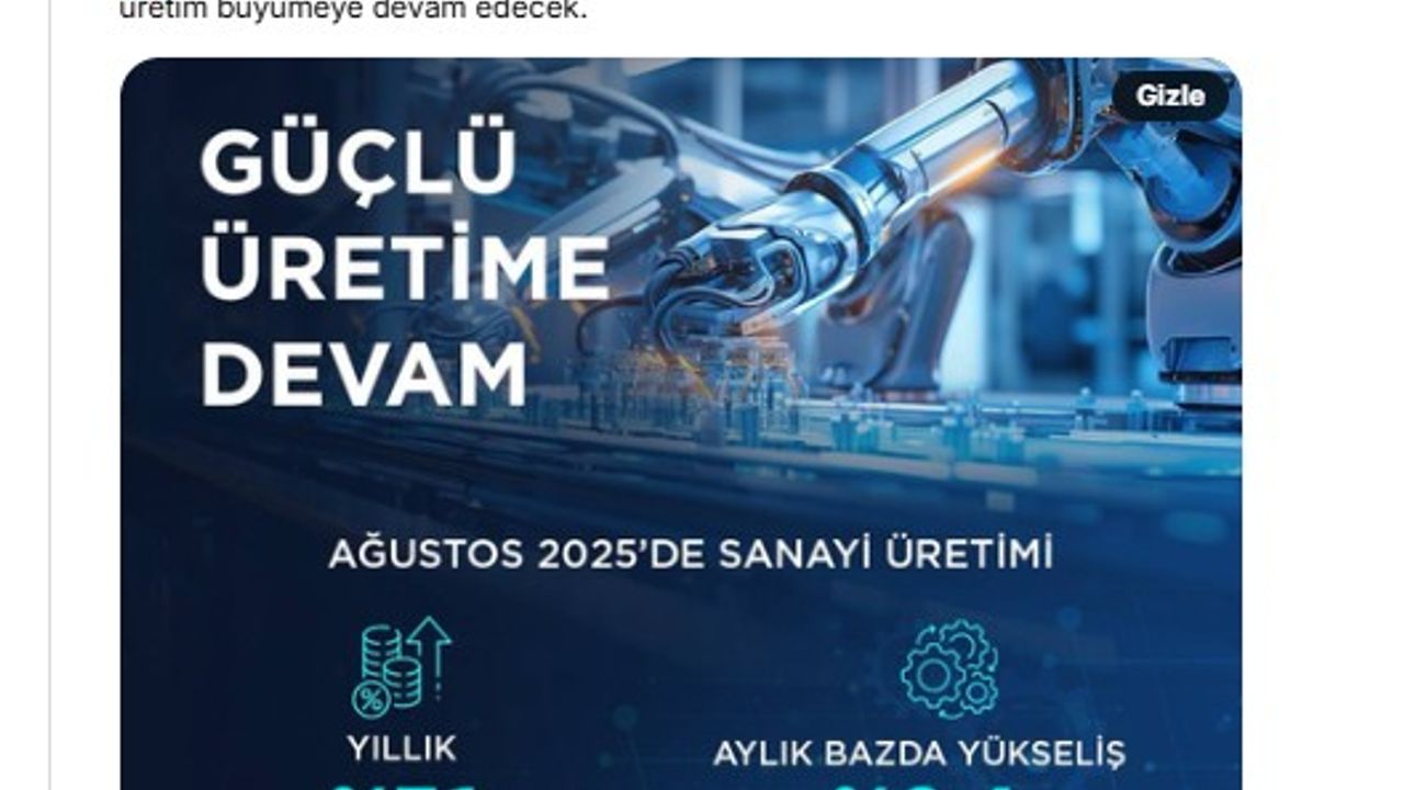 Sanayi ve Teknoloji Bakanı Mehmet Fatih Kacır, NSosyal hesabından ağustos ayı sanayi üretim endeksine ilişkin verileri değerlendirdi. Kacır, "Ağustos’ta sanayi üretim endeksi yıllık yüzde 7,1 artış kaydetti. İmalat sanayi sektörü endeksi, önceki yılın aynı ayına göre yüzde 7,7 yükseldi. Teşvik ve desteklerimizle sanayide çarklar hızla dönmeye, katma değerli üretim büyümeye devam edecek" dedi. (DHA)