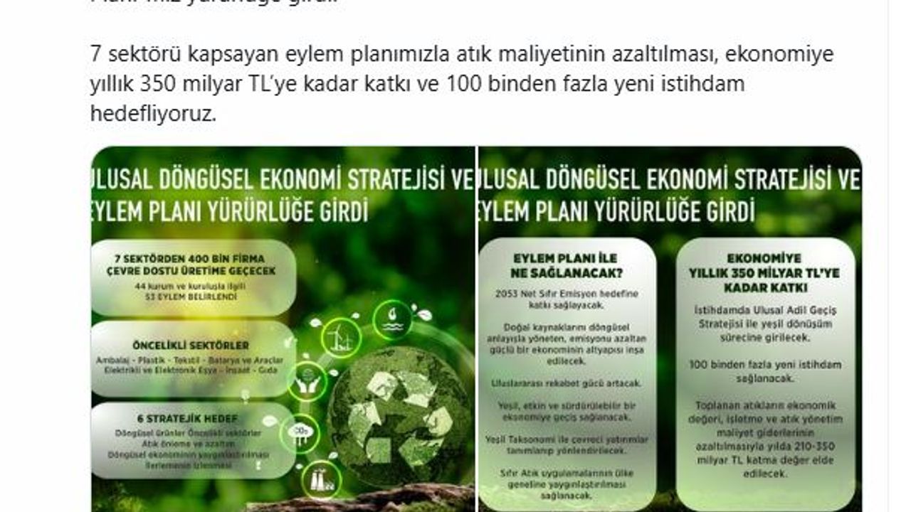Çevre, Şehircilik ve İklim Değişikliği Bakanlığı tarafından hazırlanan Ulusal Döngüsel Ekonomi Stratejisi ve Eylem Planı Resmi Gazete'de yayımlanarak yürürlüğe girdi. Çevre, Şehircilik ve İklim Değişikliği Bakanı Murat Kurum, sosyal medya hesabından yaptığı açıklamada, "2053 Net Sıfır Emisyon hedefimize ve ülkemizin döngüsel ekonomiye geçişte çok önemli bir adım olan Ulusal Döngüsel Ekonomi Stratejisi ve Eylem Planımız yürürlüğe girdi. 7 sektörü kapsayan eylem planımızla atık maliyetinin azaltılması, ekonomiye yıllık 350 milyar TL'ye kadar katkı ve 100 binden fazla yeni istihdam hedefliyoruz" ifadelerini kullandı.