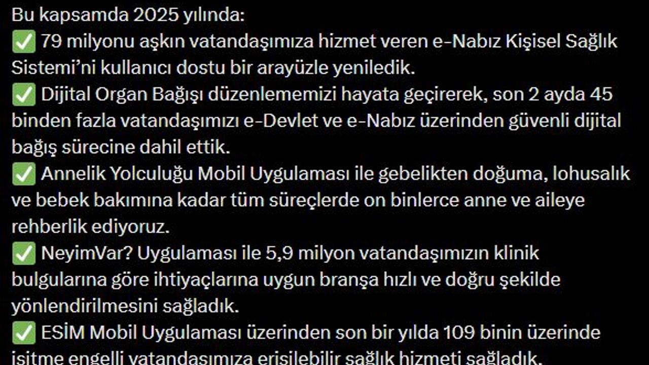 Bakan Memişoğlu, sanal medya hesabından yaptığı açıklamada, 'Sağlıkta dijital dönüşümü yerli ve milli teknolojilerimizle güçlendiriyor, vatandaşlarımızın sağlık hizmetlerine erişimini hızlandıran mobil sağlık uygulamalarımızla, etkin ve güvenli çözümler sunuyoruz. Bu kapsamda 2025 yılında 79 milyonu aşkın vatandaşımıza hizmet veren e-Nabız Kişisel Sağlık Sistemi'ni kullanıcı dostu bir arayüzle yeniledik. Dijital Organ Bağışı düzenlememizi hayata geçirerek, son 2 ayda 45 binden fazla vatandaşımızı e-Devlet ve e-Nabız üzerinden güvenli dijital bağış sürecine dahil ettik. Annelik Yolculuğu Mobil Uygulaması ile gebelikten doğuma, lohusalık ve bebek bakımına kadar tüm süreçlerde on binlerce anne ve aileye rehberlik ediyoruz. 'NeyimVar?' Uygulaması ile 5,9 milyon vatandaşımızın klinik bulgularına göre ihtiyaçlarına uygun branşa hızlı ve doğru şekilde yönlendirilmesini sağladık. ESİM Mobil Uygulaması üzerinden son bir yılda 109 binin üzerinde işitme engelli vatandaşımıza erişilebilir sağlık hizmeti sağladık. Sağlıkta dijital dönüşüm hamlelerimizle, Türkiye Yüzyılı'nda geleceğin sağlık teknolojilerini insanı merkeze alan, sürdürülebilir ve tam bağımsız bir yapıda kararlılıkla inşa etmeye devam ediyoruz' ifadelerini kullandı. (DHA)