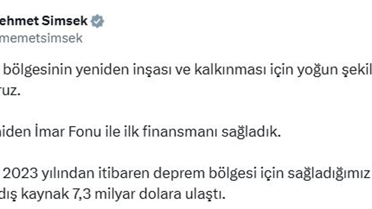 Hazine ve Maliye Bakanı Mehmet Şimşek, sosyal medya hesabından yaptığı açıklamada, "Deprem bölgesinin yeniden inşası ve kalkınması için yoğun şekilde çalışıyoruz. Afet Yeniden İmar Fonu ile ilk finansmanı sağladık. Böylece 2023 yılından itibaren deprem bölgesi için sağladığımız uygun koşullu dış kaynak 7,3 milyar dolara ulaştı" dedi. (DHA)
