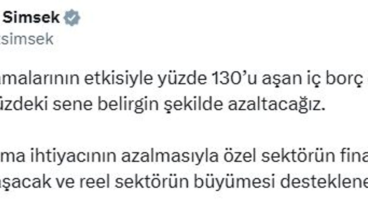 ANKARA, (DHA)- HAZİNE ve Maliye Bakanı Mehmet Şimşek, "Deprem harcamalarının etkisiyle yüzde 130’u aşan iç borç çevirme oranını önümüzdeki sene belirgin şekilde azaltacağız" dedi.