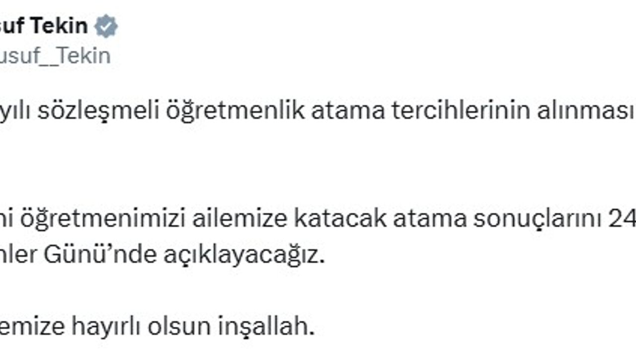 Bakan Tekin, 15 bin sözleşmeli öğretmenin atama sürecine ilişkin sosyal medya hesabından paylaşım yaptı. Tekin, "2025 yılı sözleşmeli öğretmenlik atama tercihlerinin alınması süreci başladı. 15 bin yeni öğretmenimizi ailemize katacak atama sonuçlarını 24 Kasım Öğretmenler Günü’nde açıklayacağız. Eğitim ailemize hayırlı olsun inşallah" dedi. (DHA)