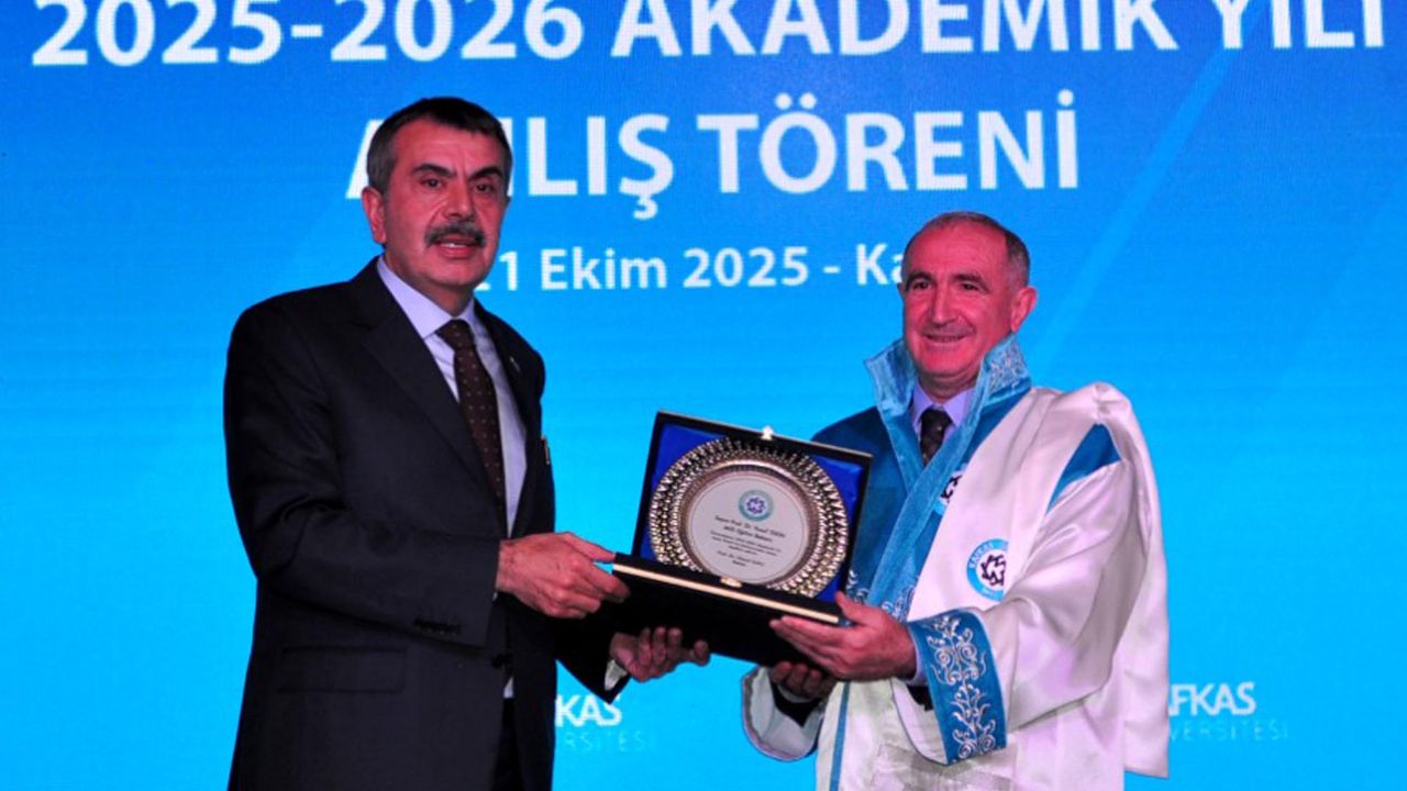 Tören sonunda Kafkas Üniversitesi Rektörü Prof. Dr. Hüsnü Kapu’nun hediye verdiği Bakan Tekin, akademisyenlerle toplu fotoğraf çekildi.