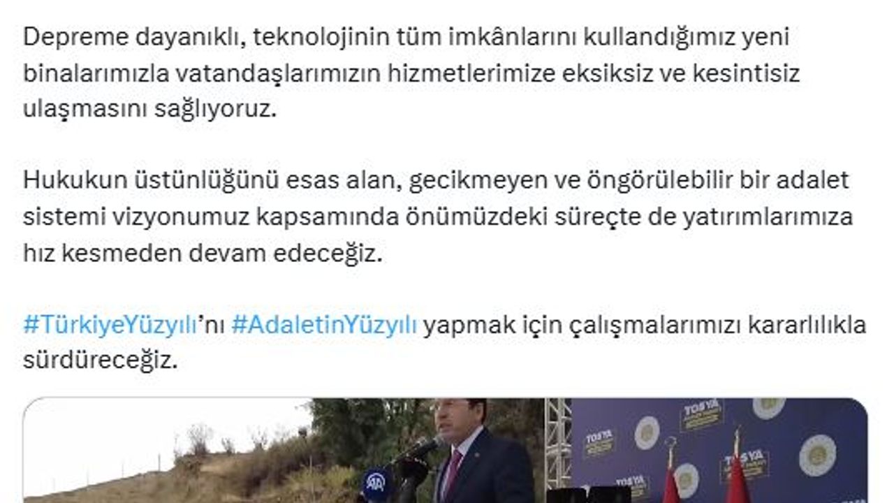 "Adaletin yüzyılını güçlü temeller üzerine inşa ediyoruz. Adalet hizmetlerimizin etkinliğini ve sunumunun kalitesini daha da artırmak için fiziki kapasitemizi güçlendiriyoruz. Ülkemizin doğusundan batısına, kuzeyinden güneyine tüm illerimizde vatandaşlarımızın adalete açılan kapısı olan adliyelerimizin, mahkemelerimizin, adli tıp grup başkanlıklarımızın temellerini atıyor, açılışlarını yapıyoruz. Depreme dayanıklı, teknolojinin tüm imkânlarını kullandığımız yeni binalarımızla vatandaşlarımızın hizmetlerimize eksiksiz ve kesintisiz ulaşmasını sağlıyoruz. Hukukun üstünlüğünü esas alan, gecikmeyen ve öngörülebilir bir adalet sistemi vizyonumuz kapsamında önümüzdeki süreçte de yatırımlarımıza hız kesmeden devam edeceğiz. 'Türkiye Yüzyılı'nı adaletin yüzyılı yapmak için çalışmalarımızı kararlılıkla sürdüreceğiz."