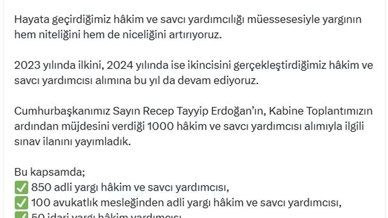 Adalet Bakanı Yılmaz Tunç, hakim ve savcı yardımcısı alımlarına ilişkin sosyal medya hesabından açıklama yaptı. Bakan Tunç, "Yargı hizmetlerinin vatandaşlarımıza daha etkili ve verimli şekilde sunulması için tarafsız ve bağımsız yargının insan kaynağını güçlendirmeye devam ediyoruz. Hayata geçirdiğimiz hakim ve savcı yardımcılığı müessesesiyle yargının hem niteliğini hem de niceliğini artırıyoruz. 2023 yılında ilkini, 2024 yılında ise ikincisini gerçekleştirdiğimiz hakim ve savcı yardımcısı alımına bu yıl da devam ediyoruz. Cumhurbaşkanımız Sayın Recep Tayyip Erdoğan'ın, Kabine toplantımızın ardından müjdesini verdiği bin hakim ve savcı yardımcısı alımıyla ilgili sınav ilanını yayımladık. Bu kapsamda; 850 adli yargı hakim ve savcı yardımcısı, 100 avukatlık mesleğinden adli yargı hakim ve savcı yardımcısı, 50 idari yargı hakim yardımcısı alımını gerçekleştireceğiz" ifadelerine yer verdi.
