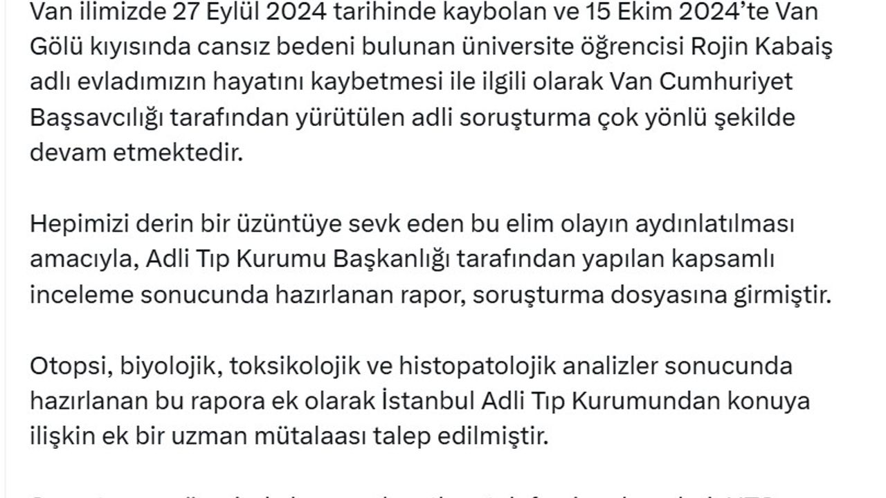 Adalet Bakanı Yılmaz Tunç, 27 Eylül 2024 tarihinde kaybolduktan sonra, 15 Ekim 2024'te Van Gölü kıyısında cansız bedeni bulunan Rojin Kabaiş'in ölümüne ilişkin soruşturmayla ilgili, sosyal medya hesabından açıklama yaptı. Bakan Tunç, "Van ilimizde 27 Eylül 2024 tarihinde kaybolan ve 15 Ekim 2024'te Van Gölü kıyısında cansız bedeni bulunan üniversite öğrencisi Rojin Kabaiş adlı evladımızın hayatını kaybetmesi ile ilgili olarak Van Cumhuriyet Başsavcılığı tarafından yürütülen adli soruşturma çok yönlü şekilde devam etmektedir. Hepimizi derin bir üzüntüye sevk eden bu elim olayın aydınlatılması amacıyla Adli Tıp Kurumu Başkanlığı tarafından yapılan kapsamlı inceleme sonucunda hazırlanan rapor, soruşturma dosyasına girmiştir. Otopsi, biyolojik, toksikolojik ve histopatolojik analizler sonucunda hazırlanan bu rapora ek olarak İstanbul Adli Tıp Kurumu’ndan konuya ilişkin ek bir uzman mütalaası talep edilmiştir. Soruşturma sürecinde kamera kayıtları, telefon incelemeleri, HTS dökümleri ve tanık ifadeleri de detaylı biçimde değerlendirilmiş, evladımızın kullandığı telefonun kilidinin açılması için yurt dışından uzmanların da dahil olduğu teknik çalışma ve bazı dijital materyallerin incelemeleri devam etmektedir. Soruşturma kapsamında, hiçbir ayrıntı göz ardı edilmeden bütün deliller ve raporlar derinlemesine incelenmekte, yargı makamlarının koordinasyonunda tüm süreç titizlikle yürütülmektedir. Başta Rojin evladımızın acılı ailesi olmak üzere milletimiz müsterih olsun; soruşturmada tek bir nokta dahi karanlıkta kalmadan maddi gerçeğin mutlaka ortaya çıkarılması için yoğun bir gayret gösterilmektedir. Rojin evladımıza bir kez daha Allah'tan rahmet, ailesine ve yakınlarına sabırlar diliyorum" ifadelerini kullandı. (DHA)