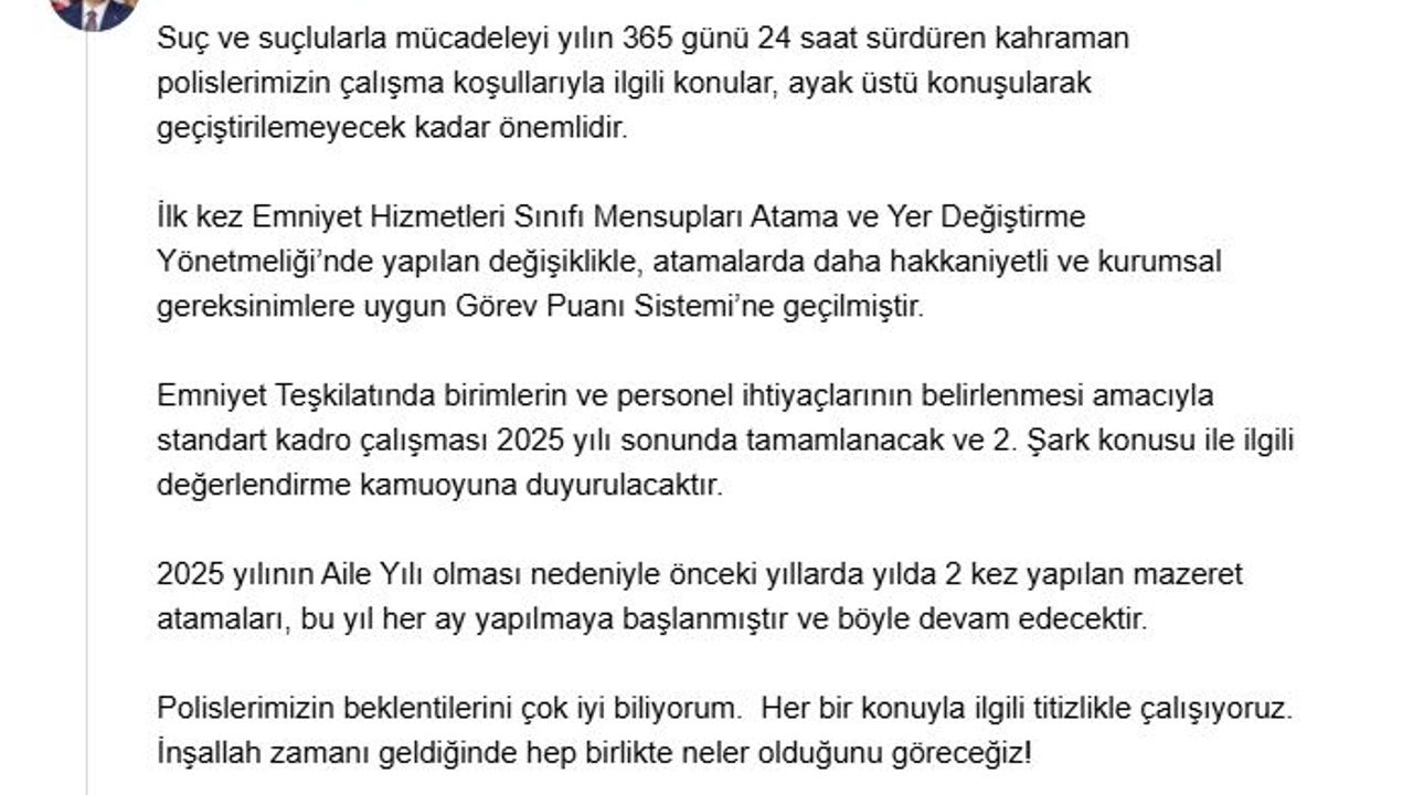 İçişleri Bakanı Ali Yerlikaya, polis atama ve yer değiştirme işlemleri ile ilgili NSosyal hesabından açıklama yaptı. Bakan Yerlikaya, "Suç ve suçlularla mücadeleyi yılın 365 günü 24 saat sürdüren kahraman polislerimizin çalışma koşullarıyla ilgili konular, ayaküstü konuşularak geçiştirilemeyecek kadar önemlidir. İlk kez Emniyet Hizmetleri Sınıfı Mensupları Atama ve Yer Değiştirme Yönetmeliği'nde yapılan değişiklikle, atamalarda daha hakkaniyetli ve kurumsal gereksinimlere uygun Görev Puanı Sistemi'ne geçilmiştir. Emniyet teşkilatında birimlerin ve personel ihtiyaçlarının belirlenmesi amacıyla standart kadro çalışması 2025 yılı sonunda tamamlanacak ve 2'nci şark konusu ile ilgili değerlendirme kamuoyuna duyurulacaktır. 2025 yılının 'Aile Yılı' olması nedeniyle önceki yıllarda yılda 2 kez yapılan mazeret atamaları, bu yıl her ay yapılmaya başlanmıştır ve böyle devam edecektir. Polislerimizin beklentilerini çok iyi biliyorum. Her bir konuyla ilgili titizlikle çalışıyoruz. İnşallah zamanı geldiğinde hep birlikte neler olduğunu göreceğiz" dedi. (DHA)