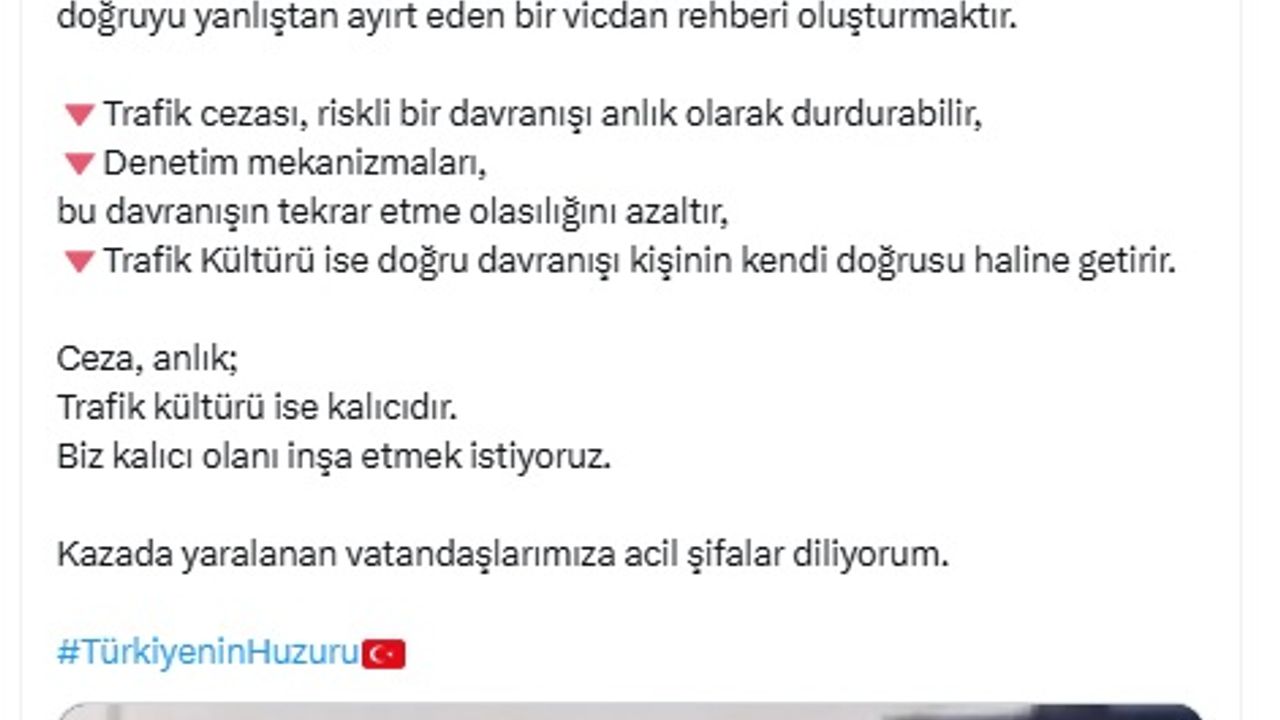 İçişleri Bakanı Ali Yerlikaya, sosyal medya hesabından bugün Konya’nın Karatay ilçesinde direksiyon hakimiyetini kaybeden M.Ç.'nin, önce karşı şeritten gelen çekiciye, ardından başka bir araca çarptığı kazanın görüntülerini paylaştı. Bakan Yerlikaya, paylaşımında 2024 yılındaki trafik kazalarında meydana gelen ölümlerin yaklaşık yüzde 47,2’sinin hız kuralına uyulmamasından meydana geldiğini belirterek, “Yeni Trafik Kanunu teklifindeki hedefimiz, sürücülere sadece trafik kurallarını ezberletmek değil, herkesin içinde doğruyu yanlıştan ayırt eden bir vicdan rehberi oluşturmaktır. Trafik cezası, riskli bir davranışı anlık olarak durdurabilir, denetim mekanizmaları, bu davranışın tekrar etme olasılığını azaltır, trafik kültürü ise doğru davranışı kişinin kendi doğrusu haline getirir. Ceza anlık, trafik kültürü ise kalıcıdır. Biz kalıcı olanı inşa etmek istiyoruz. Kazada yaralanan vatandaşlarımıza acil şifalar diliyorum” ifadelerini kullandı. (DHA)