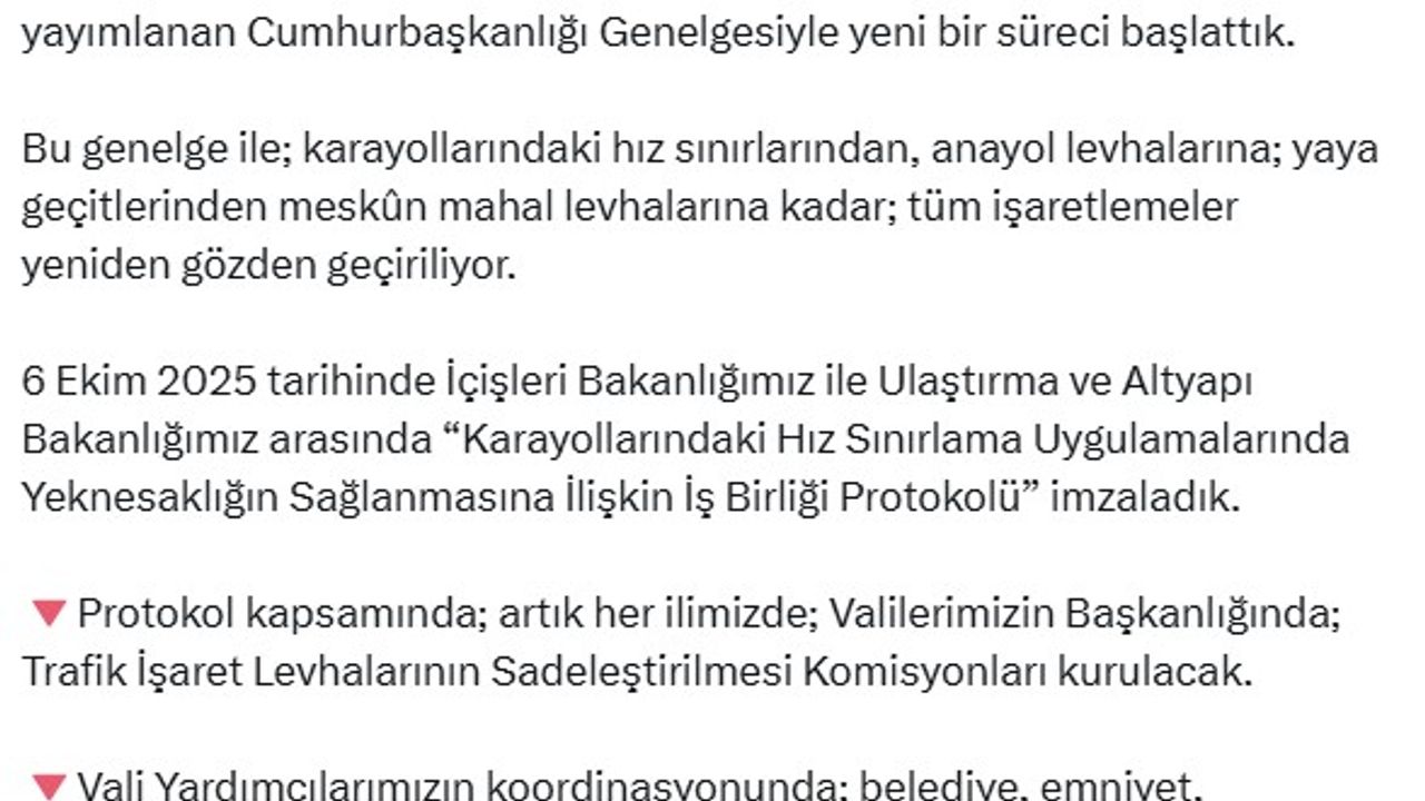 ANKARA, (DHA)- İÇİŞLERİ Bakanı Ali Yerlikaya, "Trafik güvenliği, sadece bir ulaşım konusu değil; her şeyden önce insan hayatının korunmasıdır. Her bir vatandaşımızın evine, sevdiklerine güvenle dönebilmesi için trafikte sade, anlaşılır ve etkin bir işaretleme sistemi hedefiyle yeni bir dönüşüm sürecini yürütüyoruz" dedi.