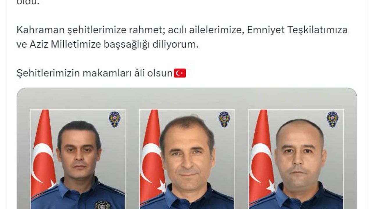 İçişleri Bakanı Ali Yerlikaya, sanal medya hesabından yaptığı paylaşımda şehitlerin isimlerini açıkladı. Bakan Yerlikaya, 'Bu sabah Yalova'da DEAŞ'lı teröristlerce düzenlenen hain saldırıda 3 kahraman polisimiz, İlker Pehlivan, Turgut Külünk ve Yasin Koçyiğit şehit oldu. Kahraman şehitlerimize rahmet; acılı ailelerimize, Emniyet Teşkilatımıza ve aziz milletimize başsağlığı diliyorum. Şehitlerimizin makamları ali olsun' dedi.