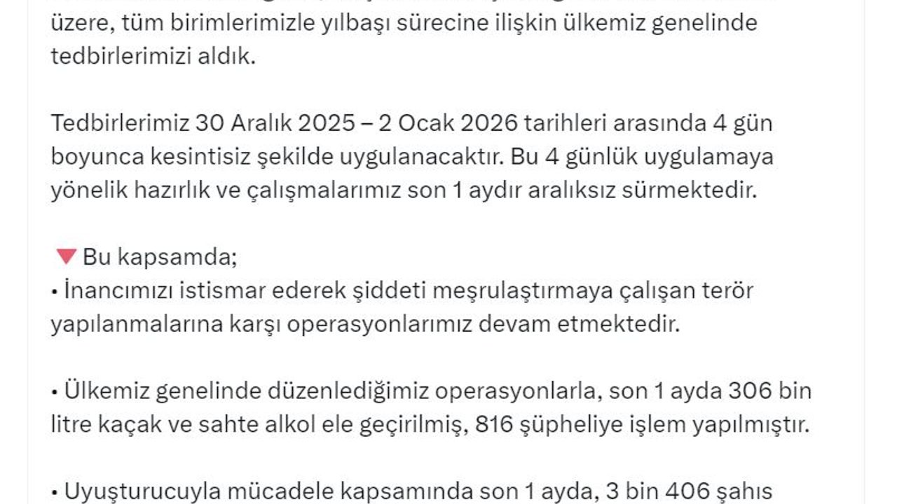 Yılbaşı tedbirlerin 30 Aralık 2025-2 Ocak 2026 tarihleri arasında 4 gün boyunca kesintisiz şekilde uygulanacağını vurgulayan Yerlikaya, 'Bu 4 günlük uygulamaya yönelik hazırlık ve çalışmalarımız son 1 aydır aralıksız sürmektedir. Bu kapsamda; inancımızı istismar ederek şiddeti meşrulaştırmaya çalışan terör yapılanmalarına karşı operasyonlarımız devam etmektedir. Ülkemiz genelinde düzenlediğimiz operasyonlarla, son 1 ayda 306 bin litre kaçak ve sahte alkol ele geçirilmiş, 816 şüpheliye işlem yapılmıştır. Uyuşturucuyla mücadele kapsamında son 1 ayda, 3 bin 406 şahıs tutuklanmış; 3,5 ton uyuşturucu madde ile 14 milyon adet uyuşturucu hap ele geçirilmiştir. Yine son 1 ayda, 2 bin 708'i hırsızlık, 297'si kasten öldürme, 433'ü cinsel suçlar ve 3 bin 218'i narkotik suçlar olmak üzere diğer suçlarla birlikte toplam 19 bin 616 hapis yakalaması olan şahıs yakalanmıştır' dedi.