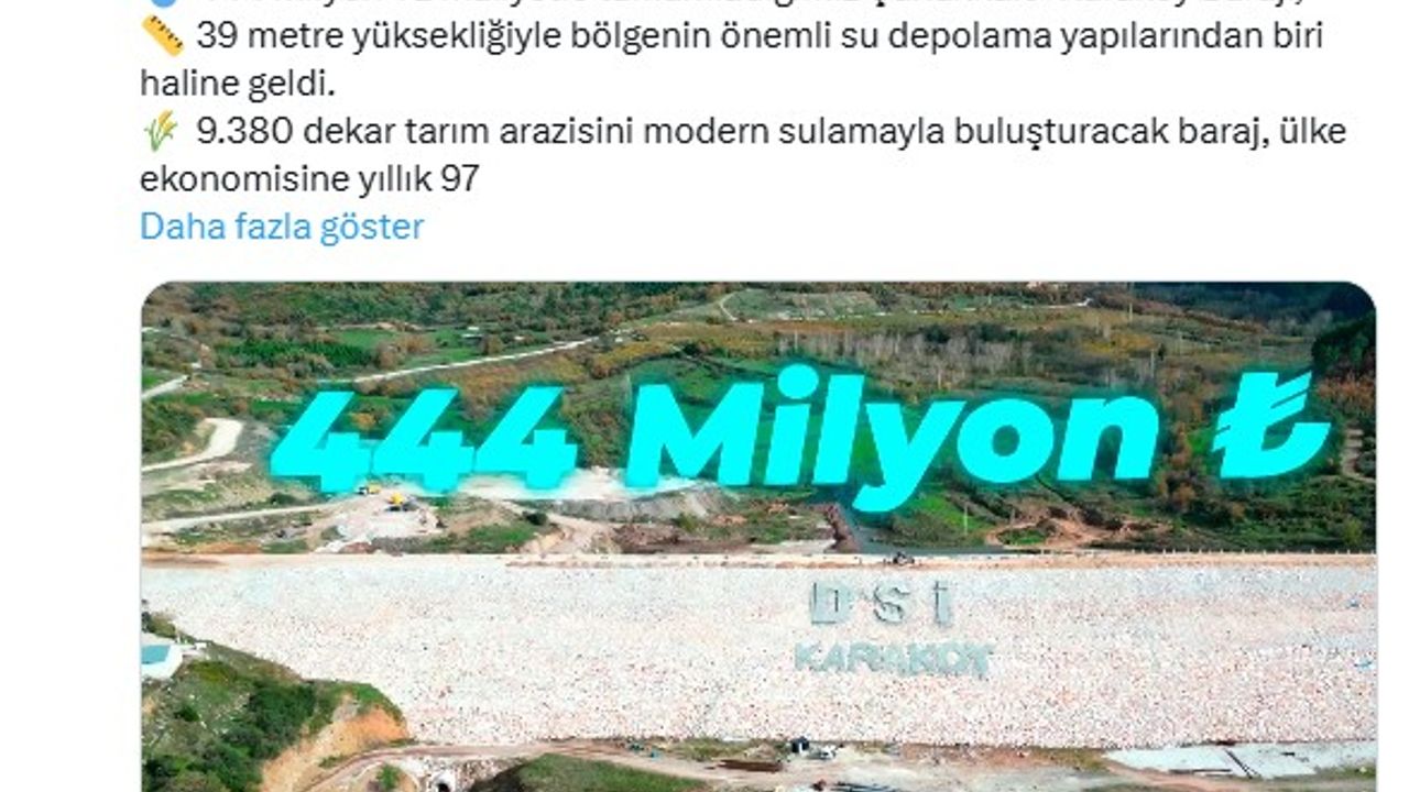 Bakan Yumaklı, sosyal medya hesabından yaptığı açıklamada, "Çanakkale'ye bir müjdemiz var. 444 milyon TL maliyetle tamamladığımız Çanakkale-Karaköy Barajı, 39 metre yüksekliğiyle bölgenin önemli su depolama yapılarından biri haline geldi. 9 bin 380 dekar tarım arazisini modern sulamayla buluşturacak baraj, ülke ekonomisine yıllık 97 milyon TL katkı sağlayacak. Bereketli olsun" dedi. (DHA)