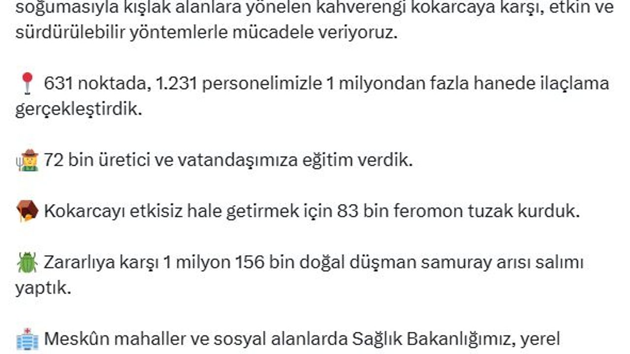 Bakan Yumaklı, sosyal medya hesabından yaptığı açıklamada, "Bazı bölgelerimizde tarımsal üretime zarar veren, havaların soğumasıyla kışlak alanlara yönelen kahverengi kokarcaya karşı, etkin ve sürdürülebilir yöntemlerle mücadele veriyoruz. 631 noktada, 1231 personelimizle 1 milyondan fazla hanede ilaçlama gerçekleştirdik. 72 bin üretici ve vatandaşımıza eğitim verdik. Kokarcayı etkisiz hale getirmek için 83 bin feromon tuzak kurduk. Zararlıya karşı 1 milyon 156 bin doğal düşman samuray arısı salımı yaptık. Meskun mahaller ve sosyal alanlarda; Sağlık Bakanlığımız, yerel yönetimlerimiz ve sivil toplum kuruluşlarımızın desteği ve iş birliğiyle bu mücadeleyi sonuna dek sürdürmeye kararlıyız. Doğayı koruyarak, üreticimizin yanında olmaya devam edeceğiz" ifadelerini kullandı. (DHA)