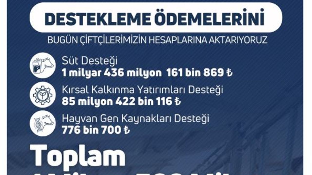 ANKARA, (DHA)- TARIM ve Orman Bakanı İbrahim Yumaklı, 1 milyar 522 milyon TL tarımsal destek ödemesinin bugün çiftçilerin hesaplarına aktarıldığını duyurdu.