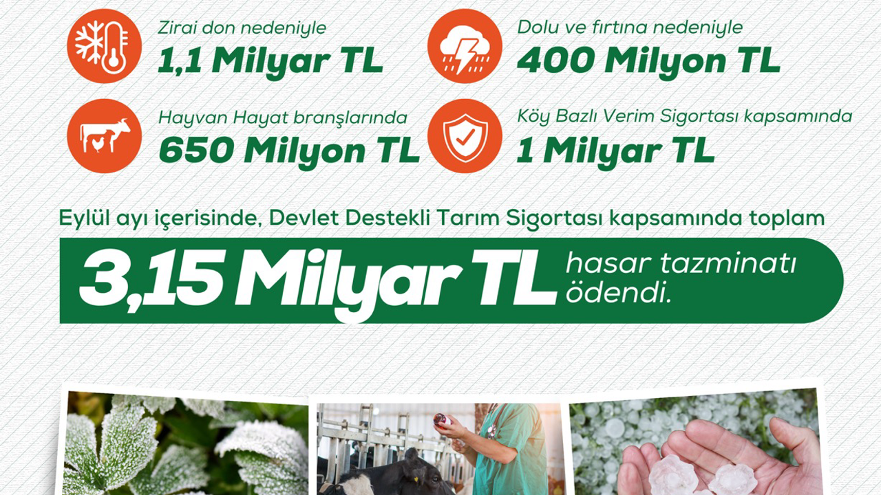 ANKARA, (DHA)- TARIM ve Orman Bakanı İbrahim Yumaklı, "Eylül ayında Devlet Destekli Tarım Sigortası kapsamında üreticilerimize 3 milyar 150 milyon TL hasar tazminatı ödedik" dedi.