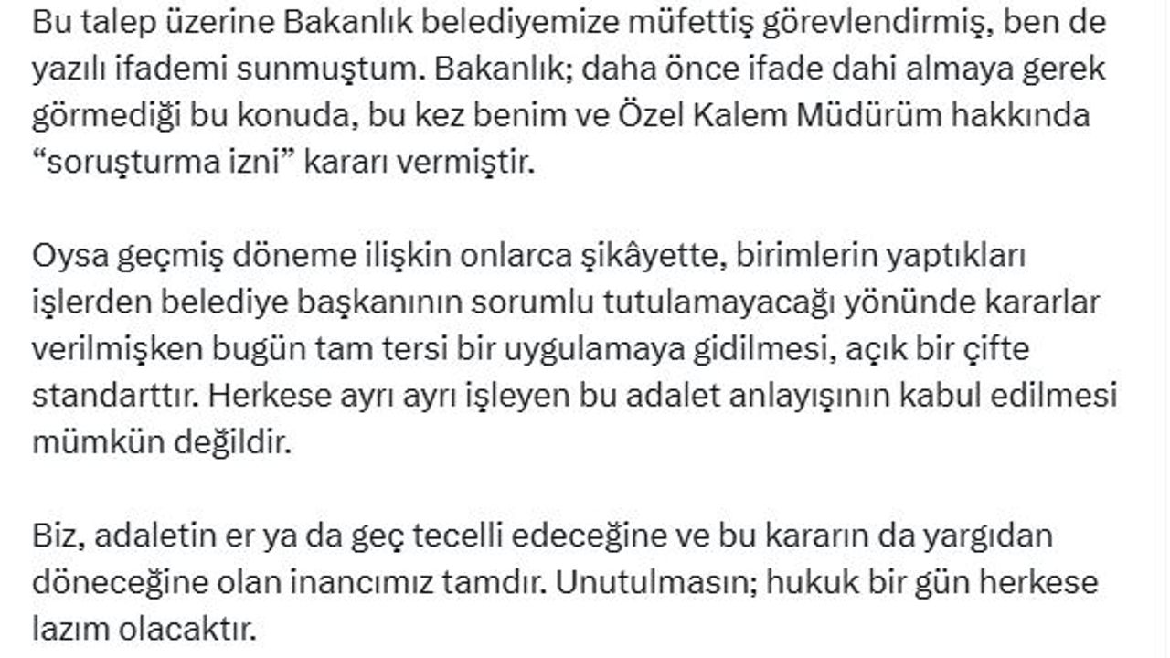 Ankara Büyükşehir Belediye Başkanı Mansur Yavaş, İçişleri Bakanlığı'nın soruşturma izni kararına ilişkin sosyal medya hesabından açıklama yaptı. Yavaş, "Hatırlanacağı üzere; Ankara Cumhuriyet Başsavcılığı tarafından yürütülen konser soruşturması kapsamında, adımın dahi yer almadığı bir iddianame için İçişleri Bakanlığı'ndan soruşturma izni talep edilmişti. Bu talep üzerine bakanlık belediyemize müfettiş görevlendirmiş, ben de yazılı ifademi sunmuştum. Bakanlık; daha önce ifade dahi almaya gerek görmediği bu konuda, bu kez benim ve Özel Kalem Müdürüm hakkında soruşturma izni kararı vermiştir. Oysa geçmiş döneme ilişkin onlarca şikayette, birimlerin yaptıkları işlerden belediye başkanının sorumlu tutulamayacağı yönünde kararlar verilmişken, bugün tam tersi bir uygulamaya gidilmesi, açık bir çifte standarttır. Herkese ayrı ayrı işleyen bu adalet anlayışının kabul edilmesi mümkün değildir. Adaletin er ya da geç tecelli edeceğine ve bu kararın da yargıdan döneceğine olan inancımız tamdır. Unutulmasın; hukuk bir gün herkese lazım olacaktır. Ayrıca yasal hakkımızı kullanarak en kısa sürede Danıştay'a itiraz edeceğiz. Daha kapsamlı açıklamayı ise pazartesi günü kamuoyuyla paylaşacağım" dedi. (DHA)