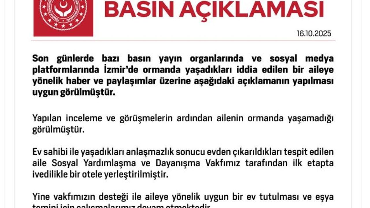 Bakanlığın sosyal medya hesabından yapılan açıklamada, "Son günlerde bazı basın yayın organlarında ve sosyal medya platformlarında İzmir'de ormanda yaşadıkları iddia edilen bir aileye yönelik haber ve paylaşımlar üzerine aşağıdaki açıklamanın yapılması uygun görülmüştür. Yapılan inceleme ve görüşmelerin ardından ailenin ormanda yaşamadığı görülmüştür. Ev sahibi ile yaşadıkları anlaşmazlık sonucu evden çıkarıldıkları tespit edilen aile, Sosyal Yardımlaşma ve Dayanışma Vakfımız tarafından ilk etapta ivedilikle bir otele yerleştirilmiştir. Yine vakfımızın desteği ile aileye yönelik uygun bir ev tutulması ve eşya temini için çalışmalarımız devam etmektedir" denildi. (DHA)